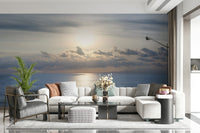 Experience the captivating allure of 'Ocean's Golden Embrace,' a wallpaper designed to transport you to a tranquil coastal haven. The image showcases a breathtaking sunset, where the sun's golden rays pierce through a veil of delicate clouds, casting a radiant glow upon the tranquil ocean. The water's surface mirrors the celestial spectacle, creating a mesmerising interplay of light and shadow. This wallpaper is more than just a visual; it's an invitation to unwind, find solace, and let the calming energy of the ocean wash over you. Its soft, natural colour palette seamlessly integrates into various interior settings, adding a touch of sophisticated serenity to your personal sanctuary.