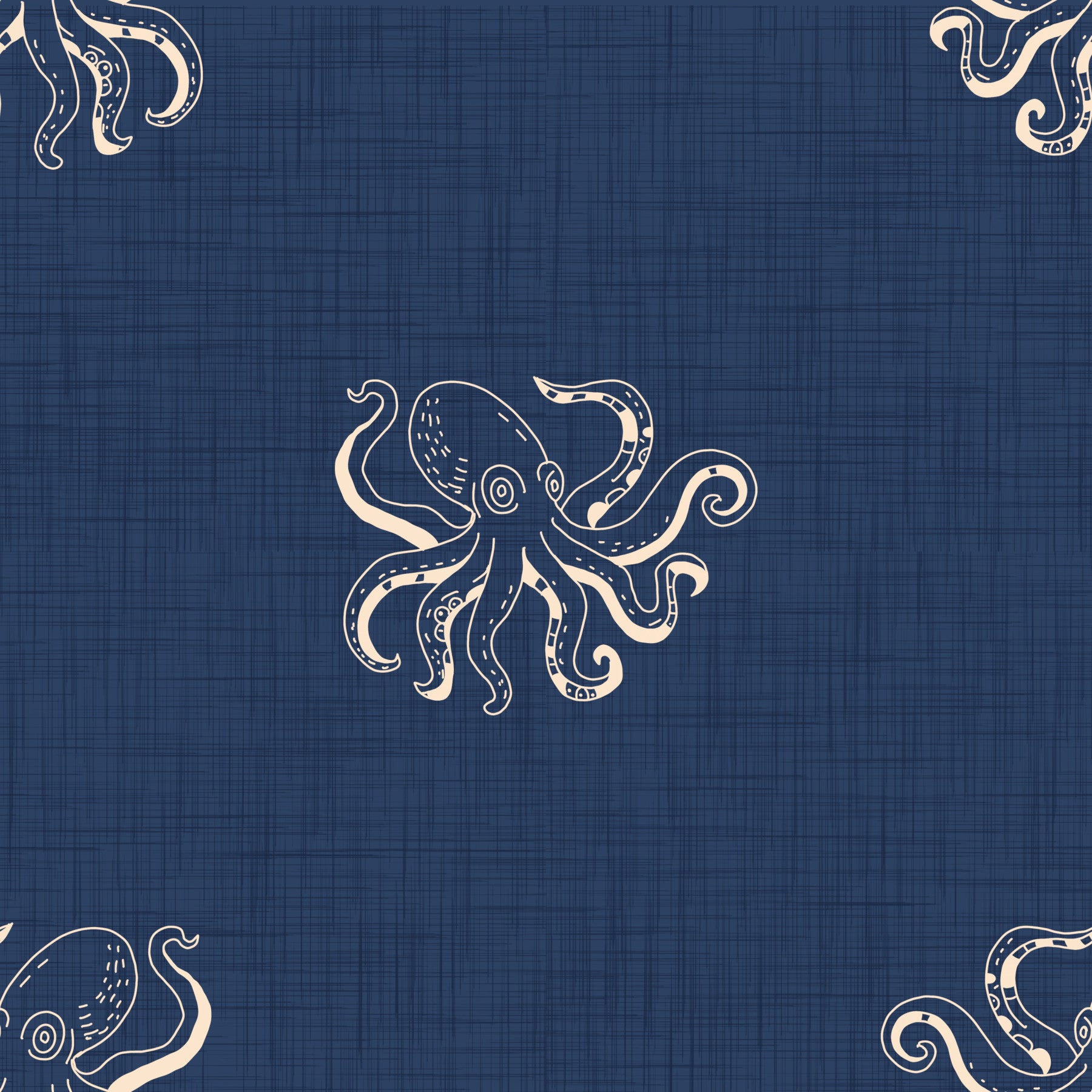 Dive into the depths of classic nautical lore with this 'Octopus Nautical Mythology' wallpaper. The design showcases a vintage-inspired illustration of an octopus, a legendary denizen of the sea, rendered in a clean, retro style. Against a textured, deep blue background reminiscent of aged canvas or antique nautical charts, the off-white octopus motif evokes a sense of timeless maritime adventure. This wallpaper brings a touch of mythical sea creature wonder to any space, perfect for adding a subtle yet captivating nautical aesthetic.
