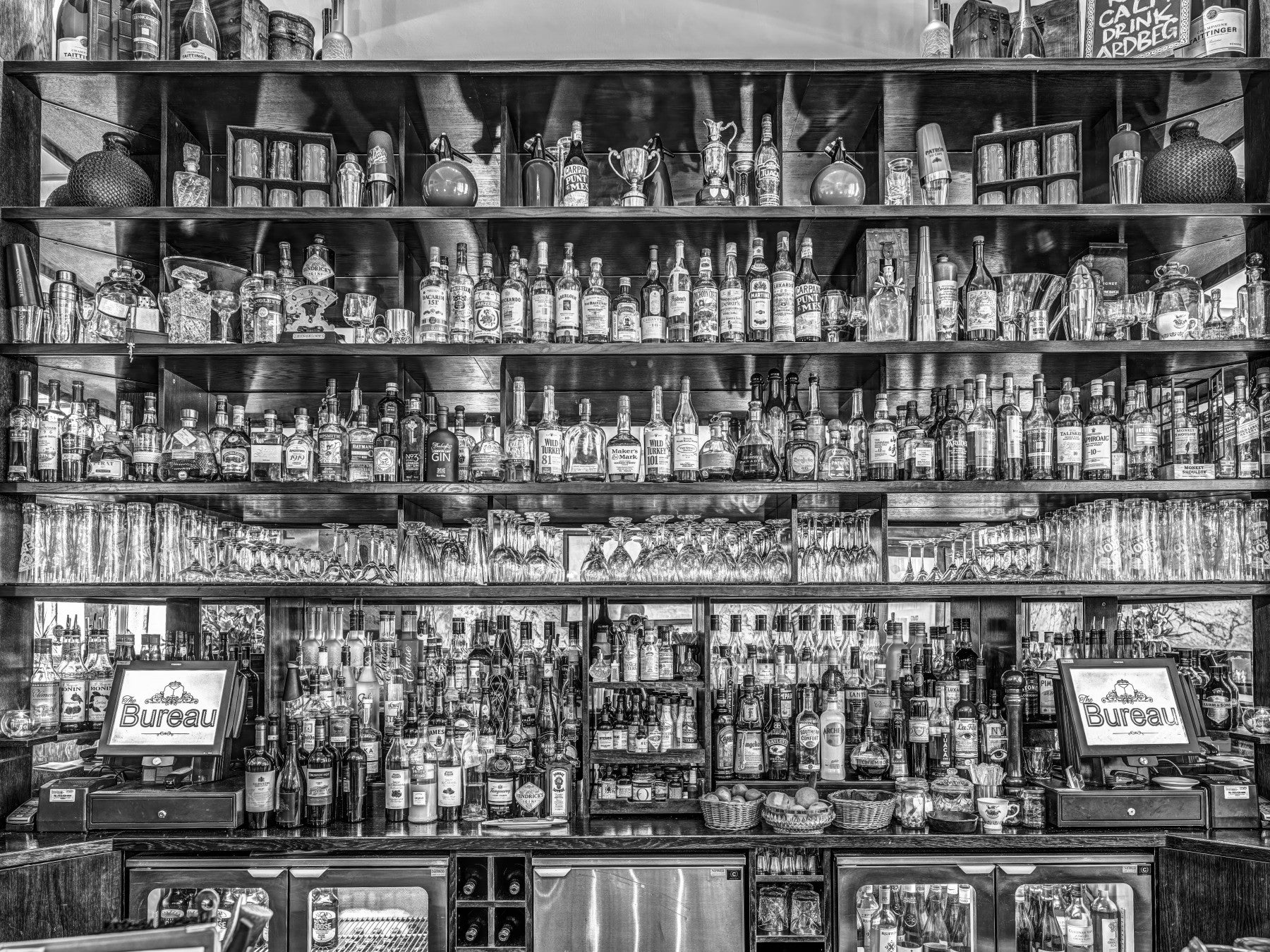Grayscale bar mural with vintage liquor display