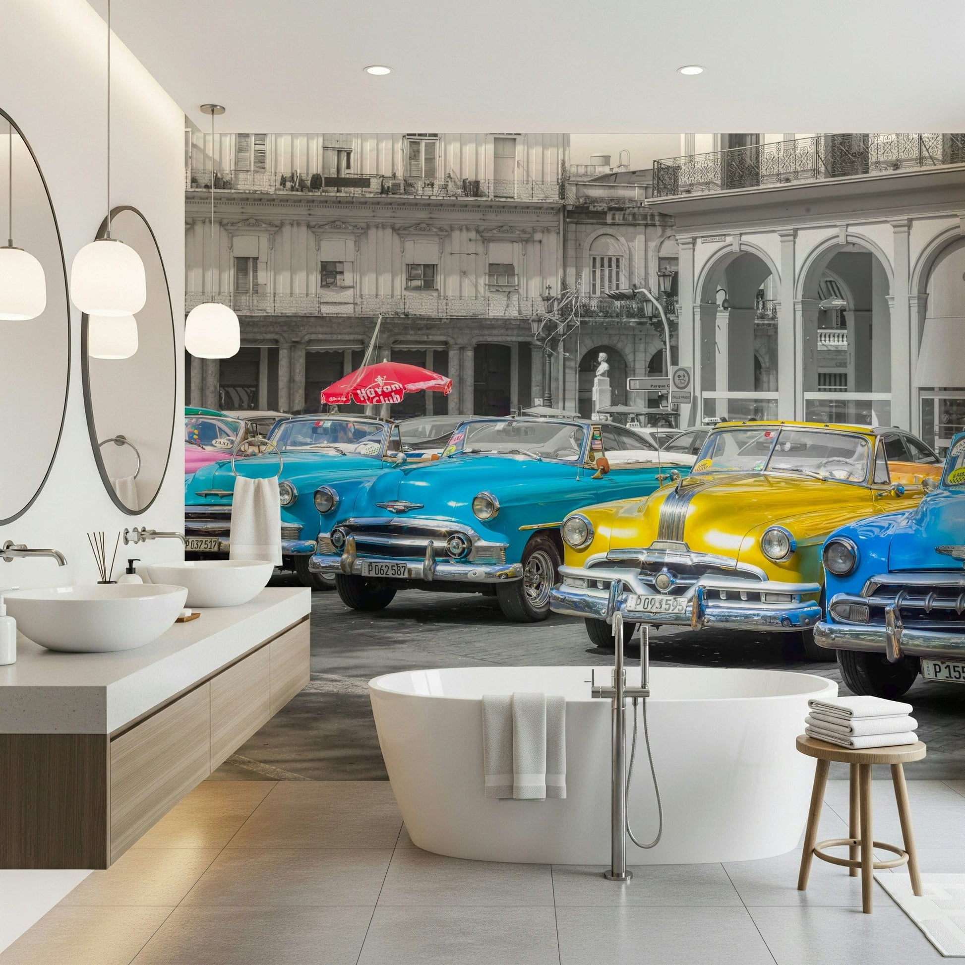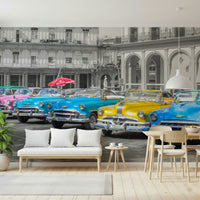 Traditional Cuban cars parked in a row by the road in Havana, Cuba. Step back in time with this vibrant tableau of classic cars, reminiscent of a bygone era. A fleet of meticulously maintained vintage automobiles, bathed in a rainbow of hues, lines a street framed by elegant, monochrome architecture. The contrast between the lively colours of the vehicles and the grayscale backdrop creates a striking visual dynamic, drawing the eye to the exquisite details of each car's design. From the gleaming chrome bumpers to the curvaceous body lines, every element exudes a sense of nostalgia and timeless appeal. Imagine the stories these cars could tell, the journeys they've undertaken, and the memories they hold. Transform your space with this captivating piece of automotive history, adding a touch of retro charm and sophisticated style to any room.