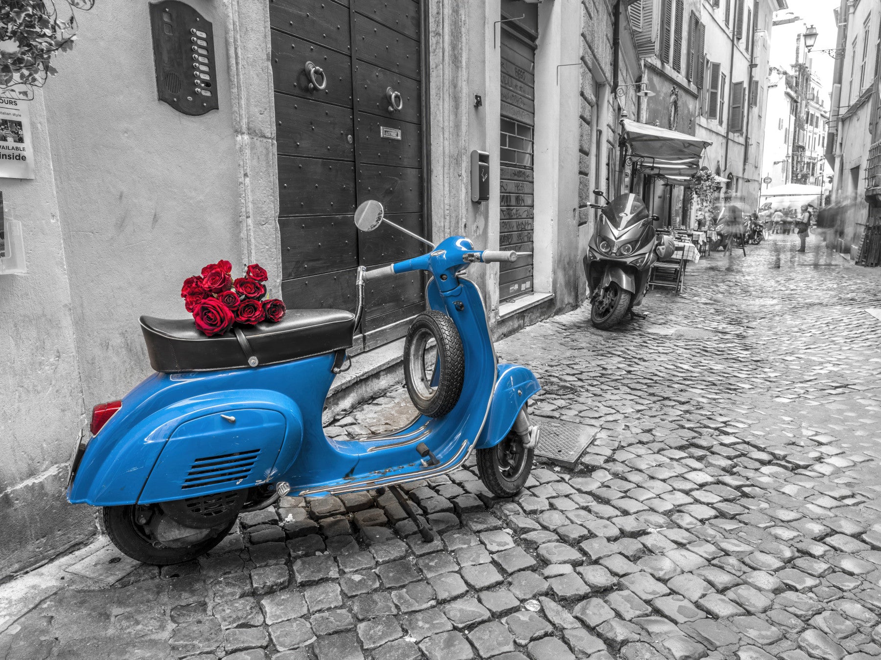 The scooter and red roses are in color, while the background is black and white.