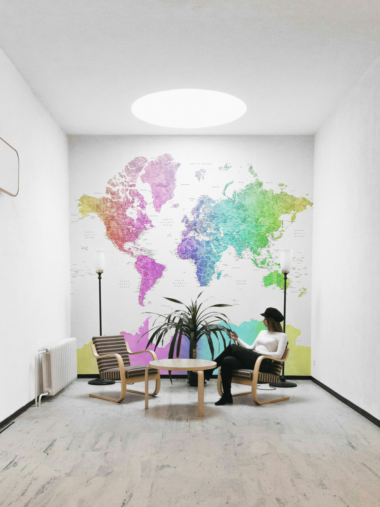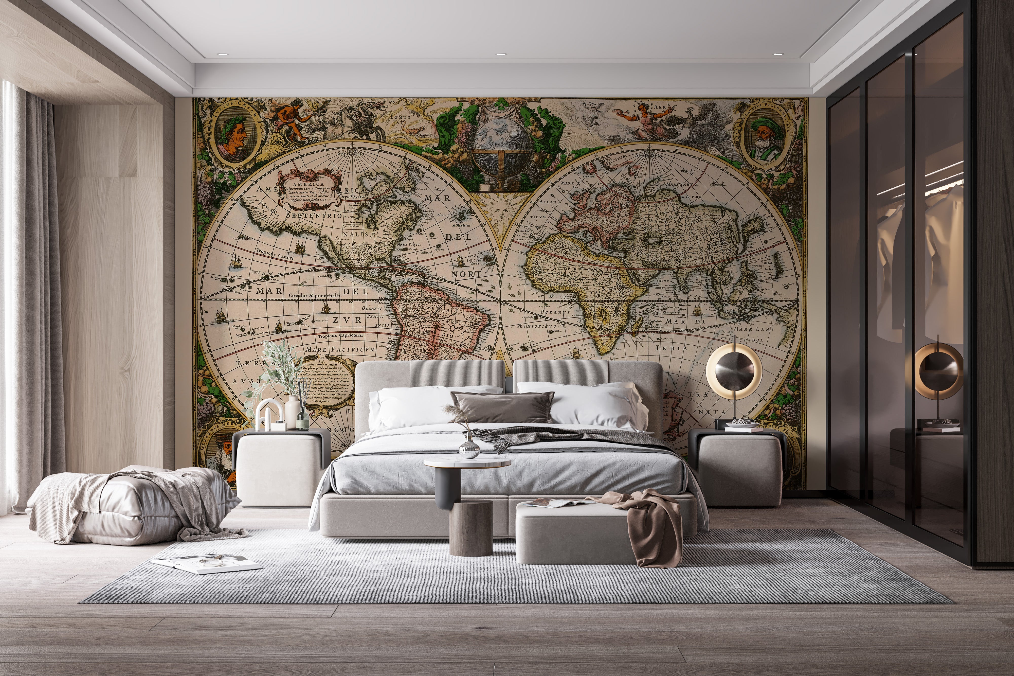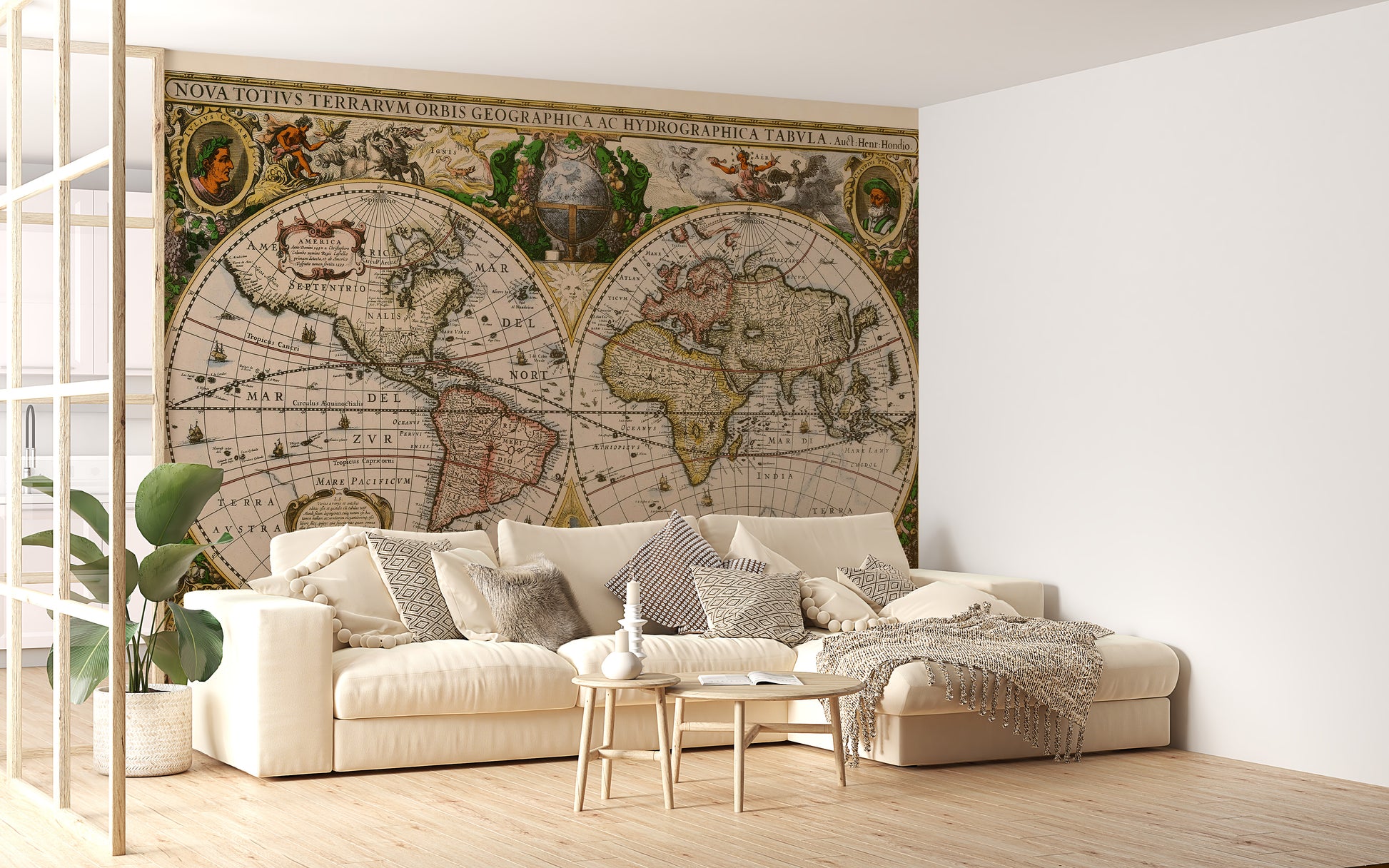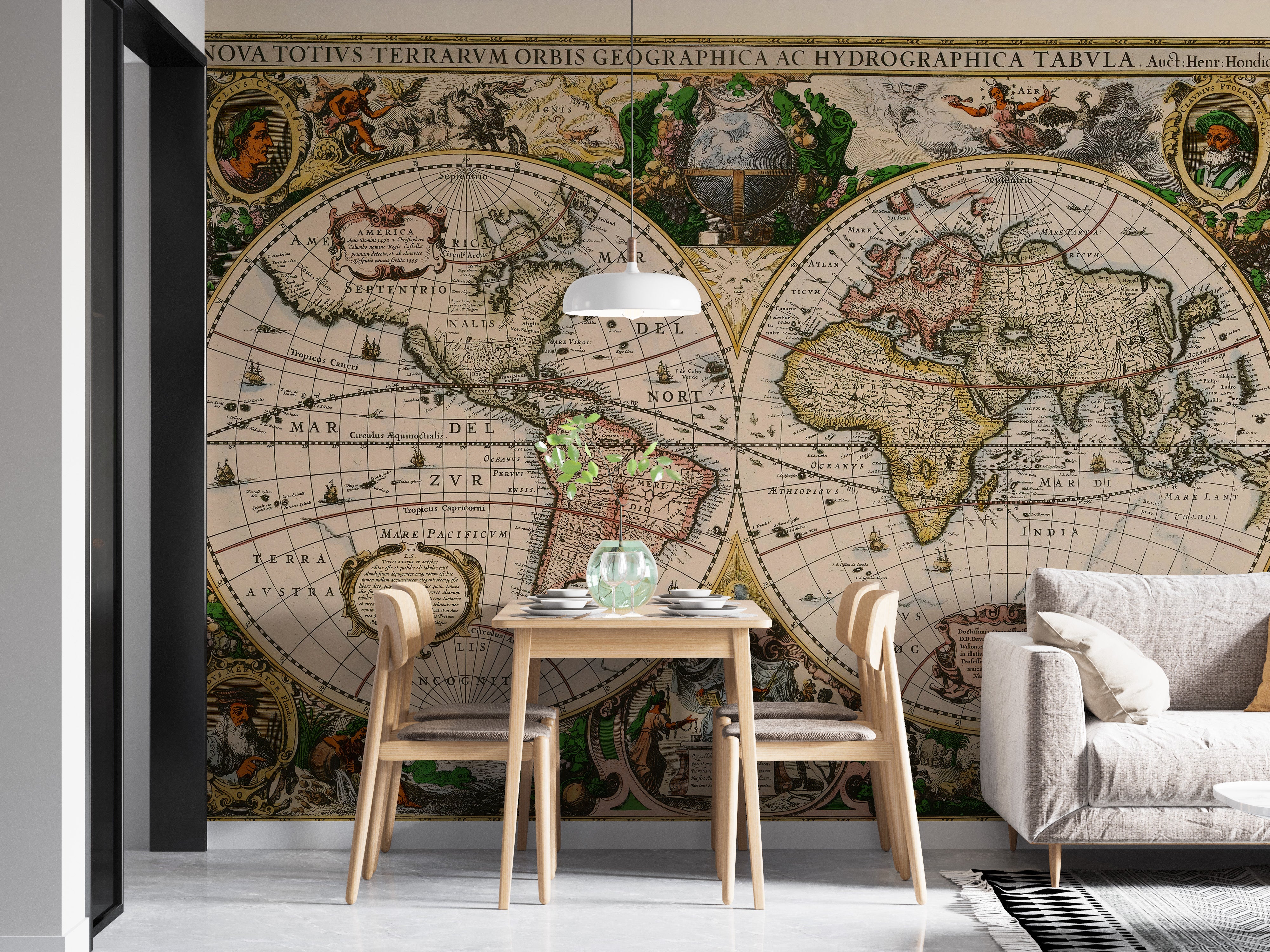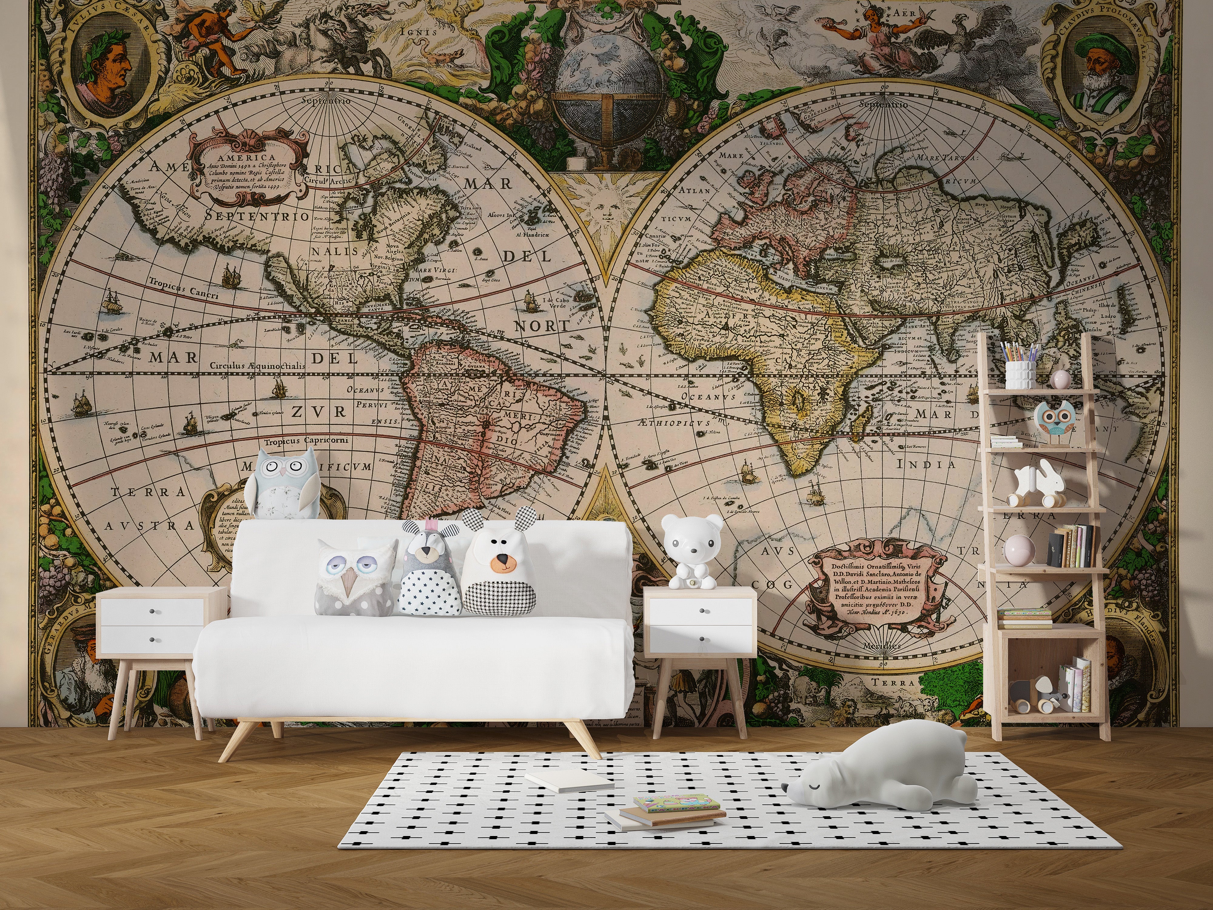 Bring the adventure and sophistication of a well-traveled office to life with a vintage atlas adventure world map mural wallpaper. This world map wallpaper will transport you to a time when exploration and discovery were the buzzwords of the day. The detailed and colorful map will inspire you to not only dream of far-off destinations but also to take action and plan your next great adventure. Adding this vintage wallpaper to your office will bring an undeniable sense of refined elegance and a nod to a bygone era. Let the journey begin with this stunning world map mural wallpaper.