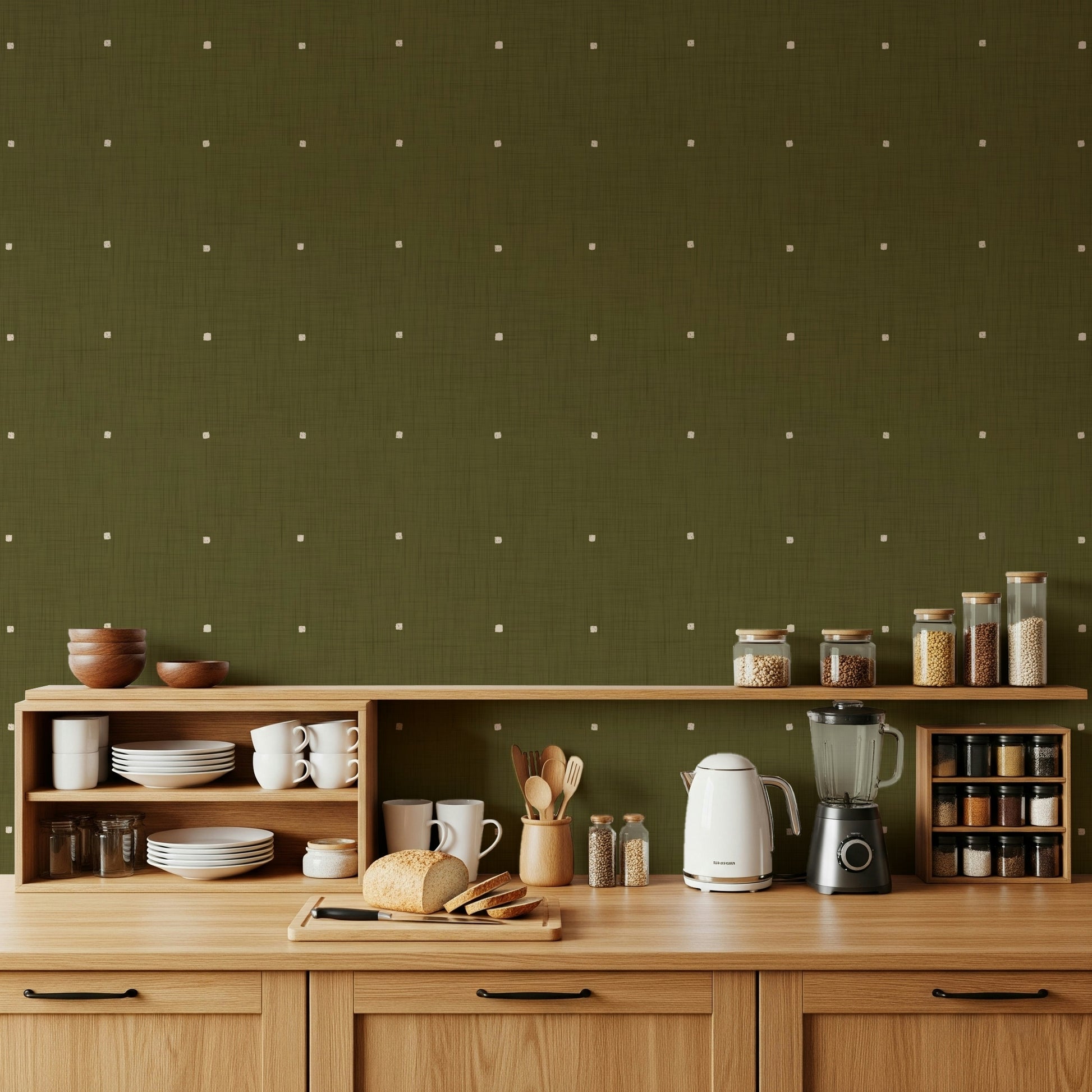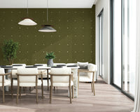 Bring subtle pattern to any space with this inviting olive green wallpaper for walls. The texture adds depth, while small white squares offer a pleasant contrast. This versatile design complements a range of interiors. Consider this in a living room or bedroom, it creates a calm, collected mood. You can enhance any room in your house with our quality, removable wallpaper. You can also use it in a hallway to add a unique touch, and it will create a beautiful backdrop for a gallery wall.