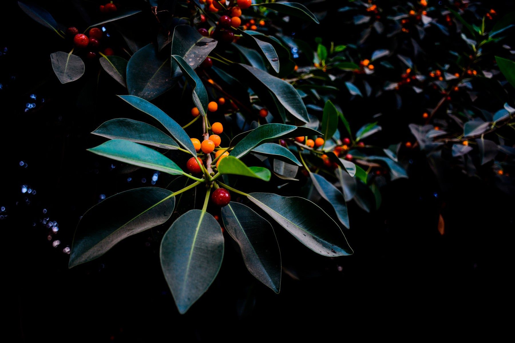 Immerse yourself in the enigmatic allure of 'Orange, Green and Dark,' a wallpaper that whispers tales of twilight gardens and hidden groves. Lush, deep green foliage spills across the scene, each leaf a study in texture and subtle light. Against the inky abyss of the background, a striking contrast emerges as clusters of vibrant orange berries punctuate the darkness, like tiny embers glowing in the night. This image balances organic serenity with bold color contrasts. The dark, moody atmosphere provides a captivating backdrop for the interplay of light and shadow on the foliage, drawing the eye into a world of mystery and subtle beauty. 'Orange, Green and Dark' is perfect for those who seek a sophisticated and dramatic aesthetic.