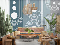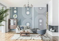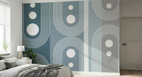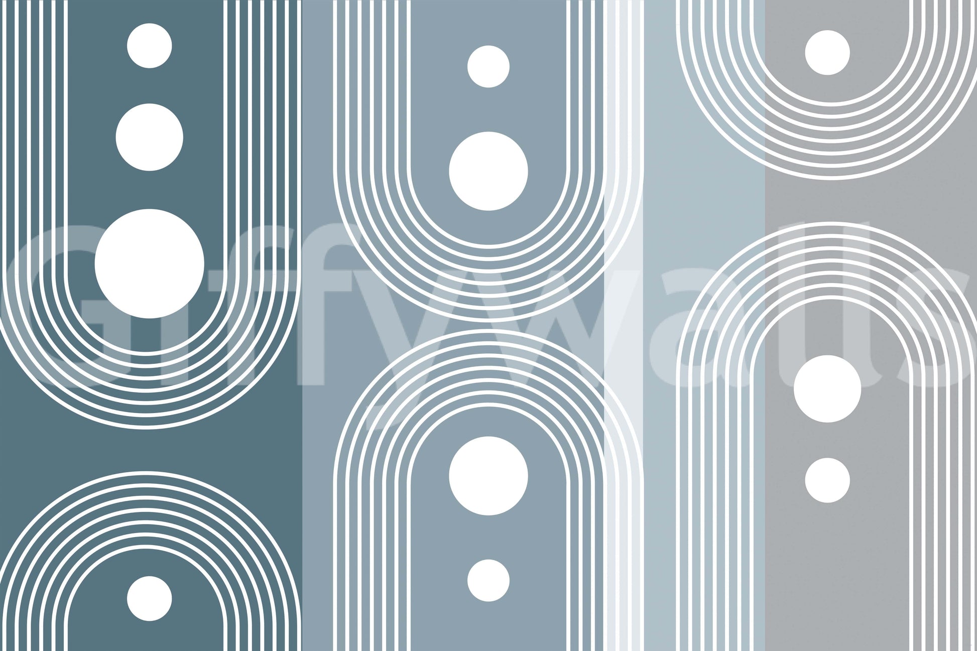 This modern wallpaper features a captivating geometric pattern of arches and circles in muted blue and grey tones. White lines create a stylish, clean look that brings depth to any room. Ideal for living rooms, bedrooms, or home offices, this design adds a touch of sophistication. The balanced composition and soft colour palette make it versatile for various decor styles. Use this wallpaper for walls to easily complement minimalist, Scandinavian, or mid-century modern interiors. It creates a serene and calming atmosphere.