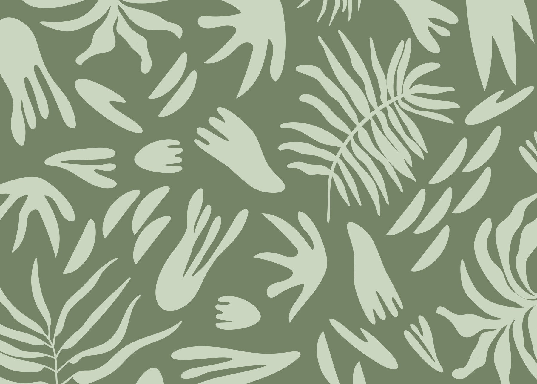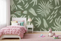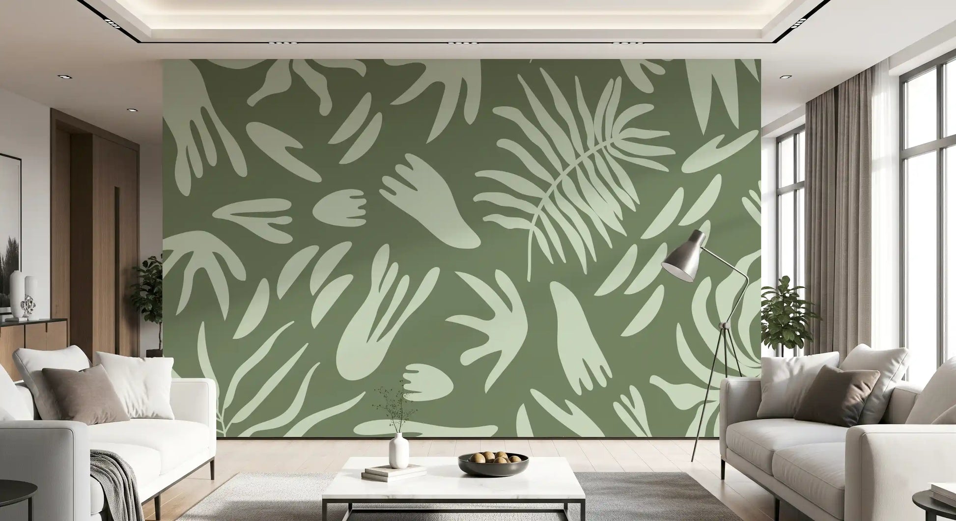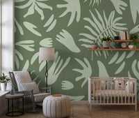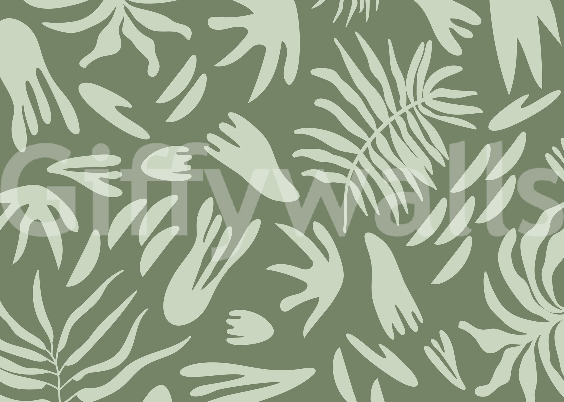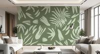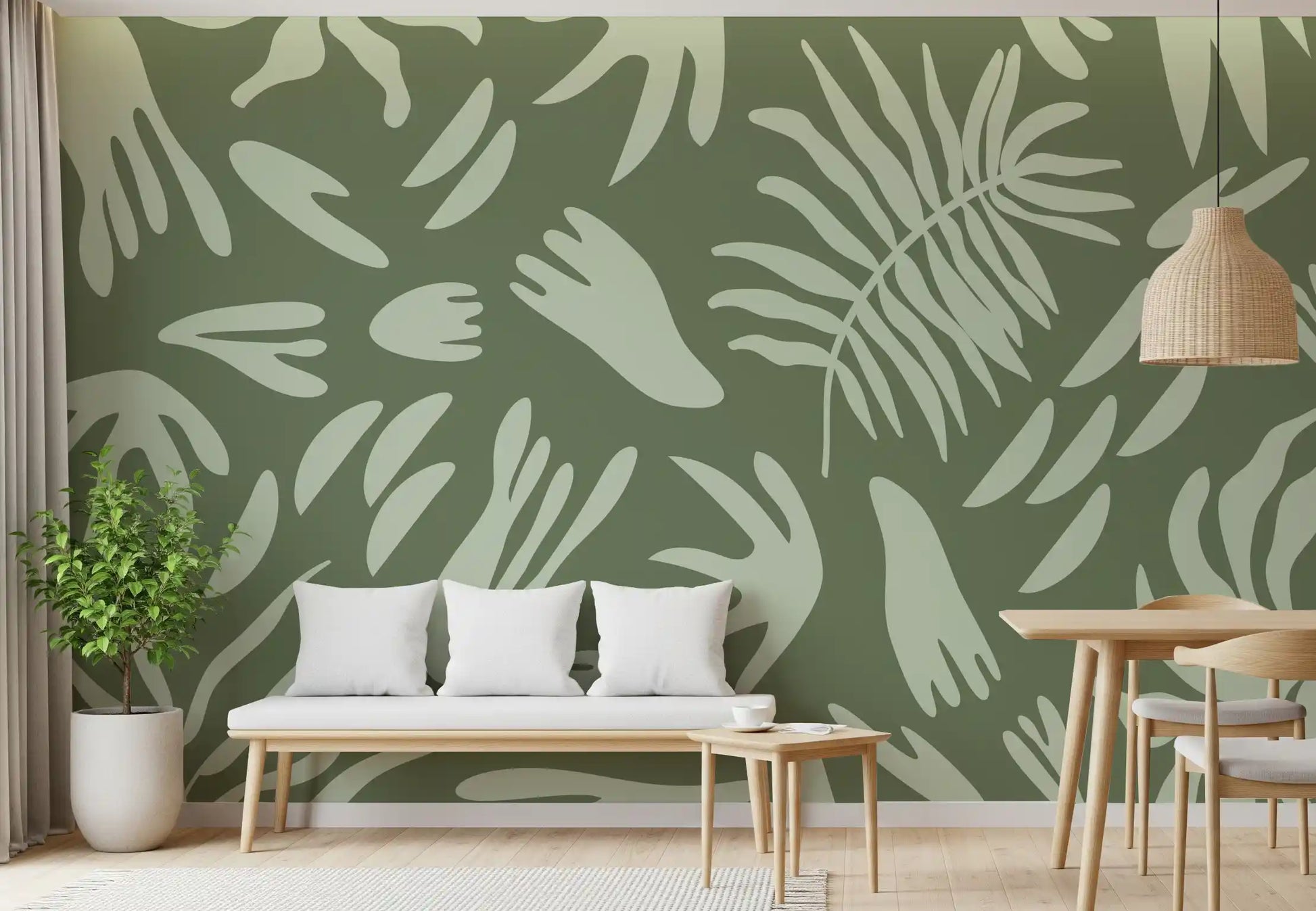 This elegant wallpaper for walls brings a serene botanical aesthetic to any interior. It features a captivating pattern of organic leaf and frond shapes, reminiscent of stylized cutouts found in modern art. The design uses a sophisticated two-tone green palette, combining a muted sage background with delicate lighter green forms. This contemporary yet earthy style perfectly complements minimalist, Scandinavian, or boho-chic interiors. It creates a calming atmosphere, adding a touch of understated elegance and natural harmony. Ideal for a tranquil living room, a peaceful bedroom, or an inspiring home office, this design transforms walls into a sophisticated, nature-infused backdrop.