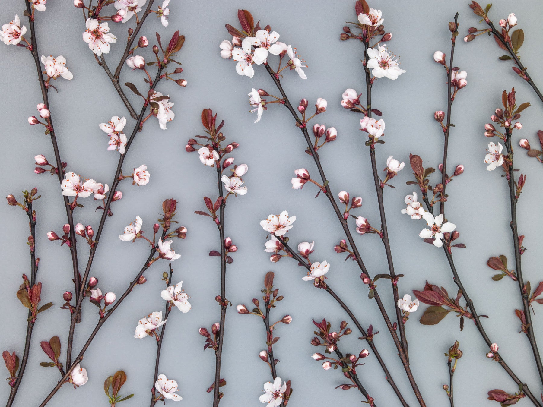 Twig design of Ornamental Cherry plant, studio shot. Bring the freshness of spring into your home with this blossom branch design. The wallpaper for walls features delicate white flowers and buds against a soft blue-grey backdrop. This botanical pattern adds a serene and refined touch to any space. It works wonders in bedrooms, living rooms, or dining rooms where you want to create a calming ambiance. The subtle colours and natural motifs provide a versatile complement to modern or traditional interiors, adding a layer of organic beauty.
