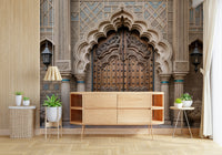 Transform your living space with this striking architectural design. This wallpaper for walls showcases an elaborate entryway featuring a grand, carved wooden door framed by detailed columns and intricate stonework. A neutral colour palette, highlighted with touches of turquoise, creates a sophisticated and timeless look. The refined pattern and formal style enhances hallways, dining rooms, or studies, adding an impressive focal point to any room. The play of light and shadow brings dimension to spaces, especially those with high ceilings, creating a grand and inviting atmosphere.