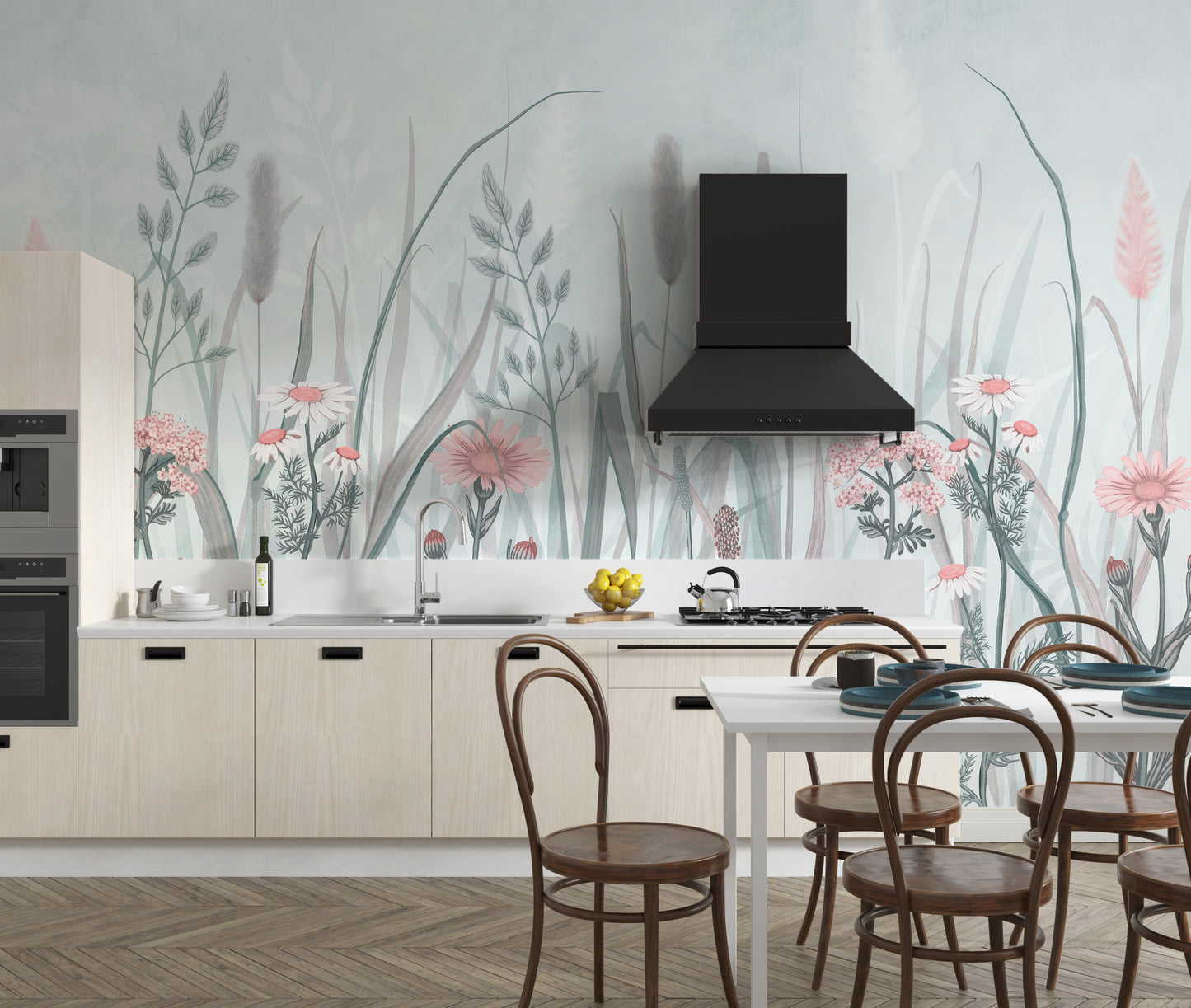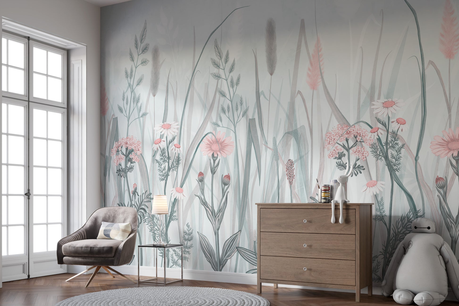Drift into a realm where petals dance in a gentle breeze with the ornate painted floral pink mural. This flower wallpaper captures the ethereal beauty of a blooming meadow, kissed by dawn's tender light. Each brushstroke tells a tale of growth and gentle beauty, harmonizing blush hues with nature’s intricate patterns. Imagine walls that bloom with life, a fusion of art and imagination, where flora’s grace meets your home’s heartbeat. Ideal for those who wish to envelop themselves in a botanical haven, this mural is a whisper of poetry for your living space. Enchant your surroundings with this delicate floral embrace that breathes new life into your daily view.