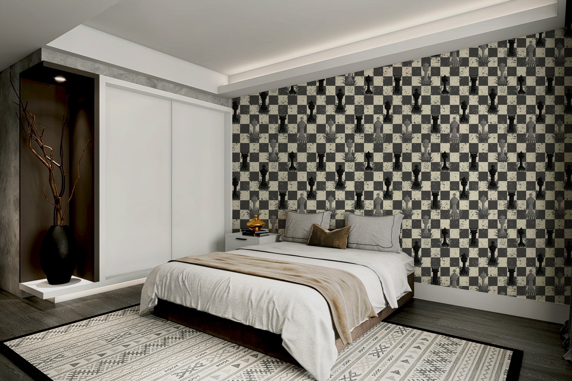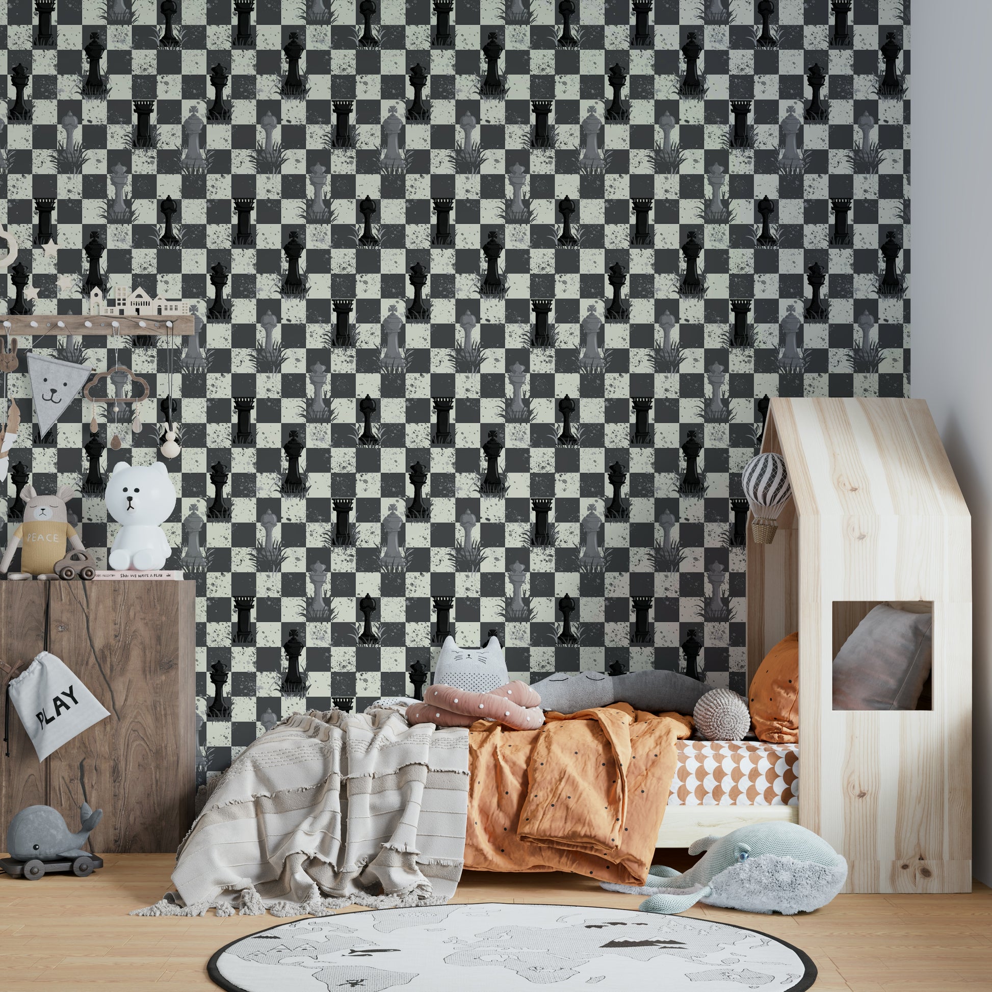 A captivating grayscale wallpaper depicting a chessboard scene, subtly infused with an outdoor ambiance. Chess pieces, rendered in varying shades of gray, appear to emerge from patches of stylized grass, adding a unique twist to the classic game. The chessboard itself is overlaid with a textured, paint-splattered effect, creating a sense of age and weathered charm. This striking contrast between the sharp lines of the chess pieces and the organic texture of the background offers a visually compelling and sophisticated design perfect for adding a touch of strategic elegance to your desktop.