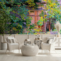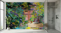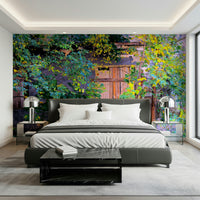 This striking piece presents a doorway enveloped by vibrant foliage, revealing the beauty of nature reclaiming its space. The interplay of colours and textures invites contemplation, showcasing the contrast between the weathered wooden door and the lush greenery surrounding it.