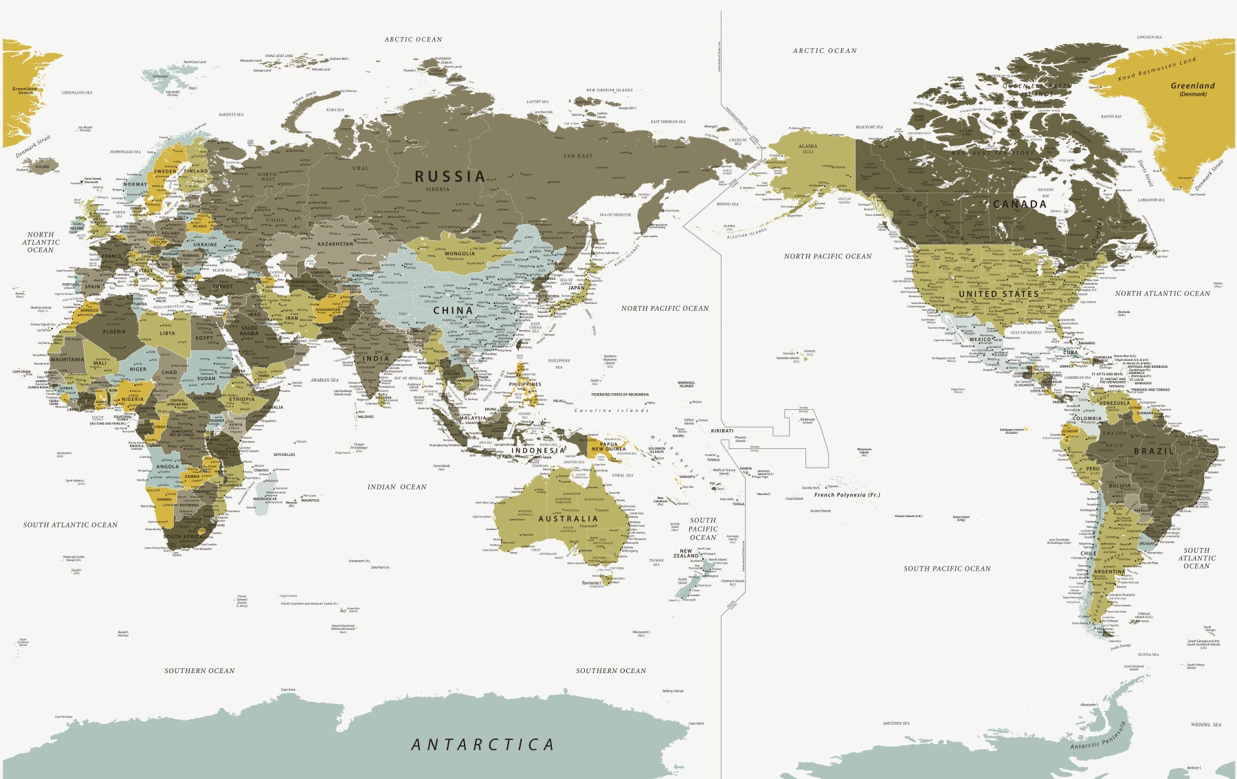 Explore the world from a unique perspective with this captivating olive green Pacific-centered world map wallpaper. The subdued, earthy tones create a calming and sophisticated mood, while the detailed cartography provides a wealth of geographical information. Each country is subtly highlighted in varying shades of olive and beige, enhancing the map's visual appeal and readability. This wallpaper is perfect for home offices, classrooms, or anywhere you want to bring a touch of geographic elegance and a peaceful atmosphere.