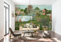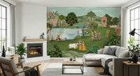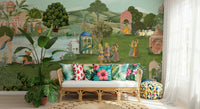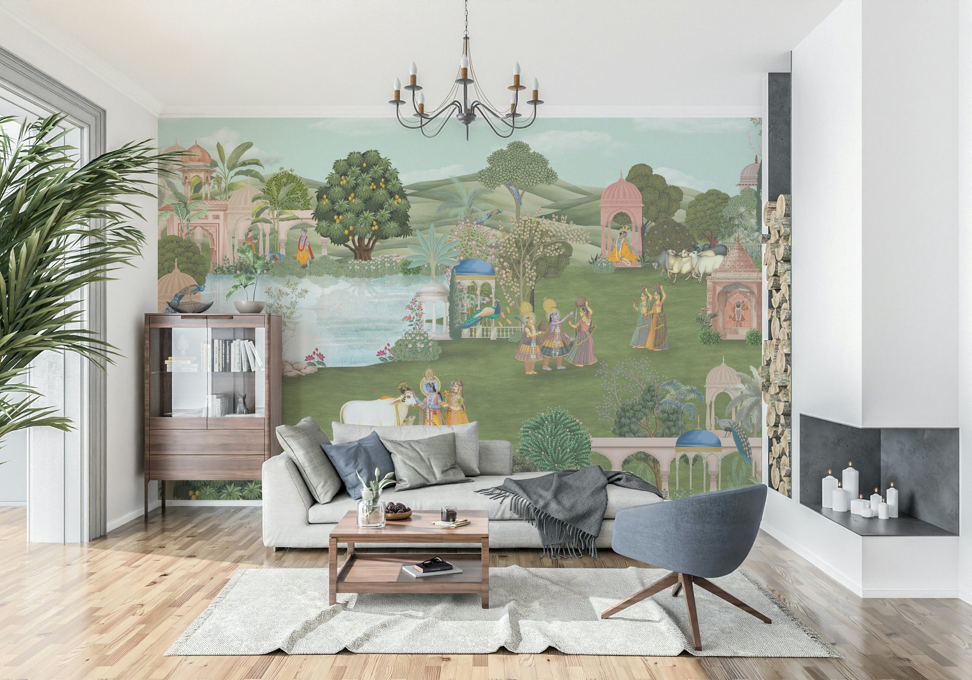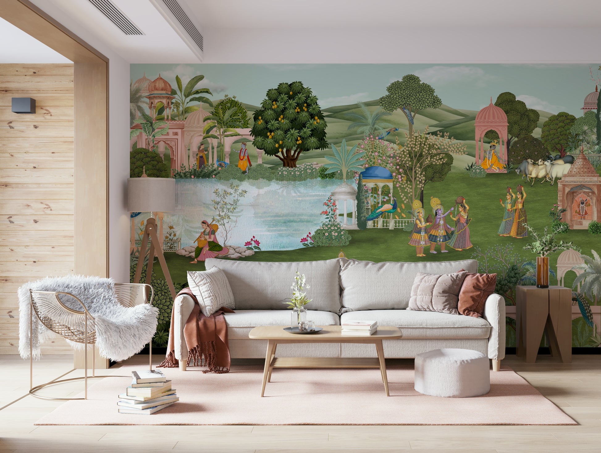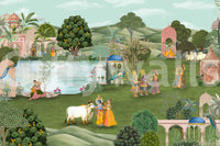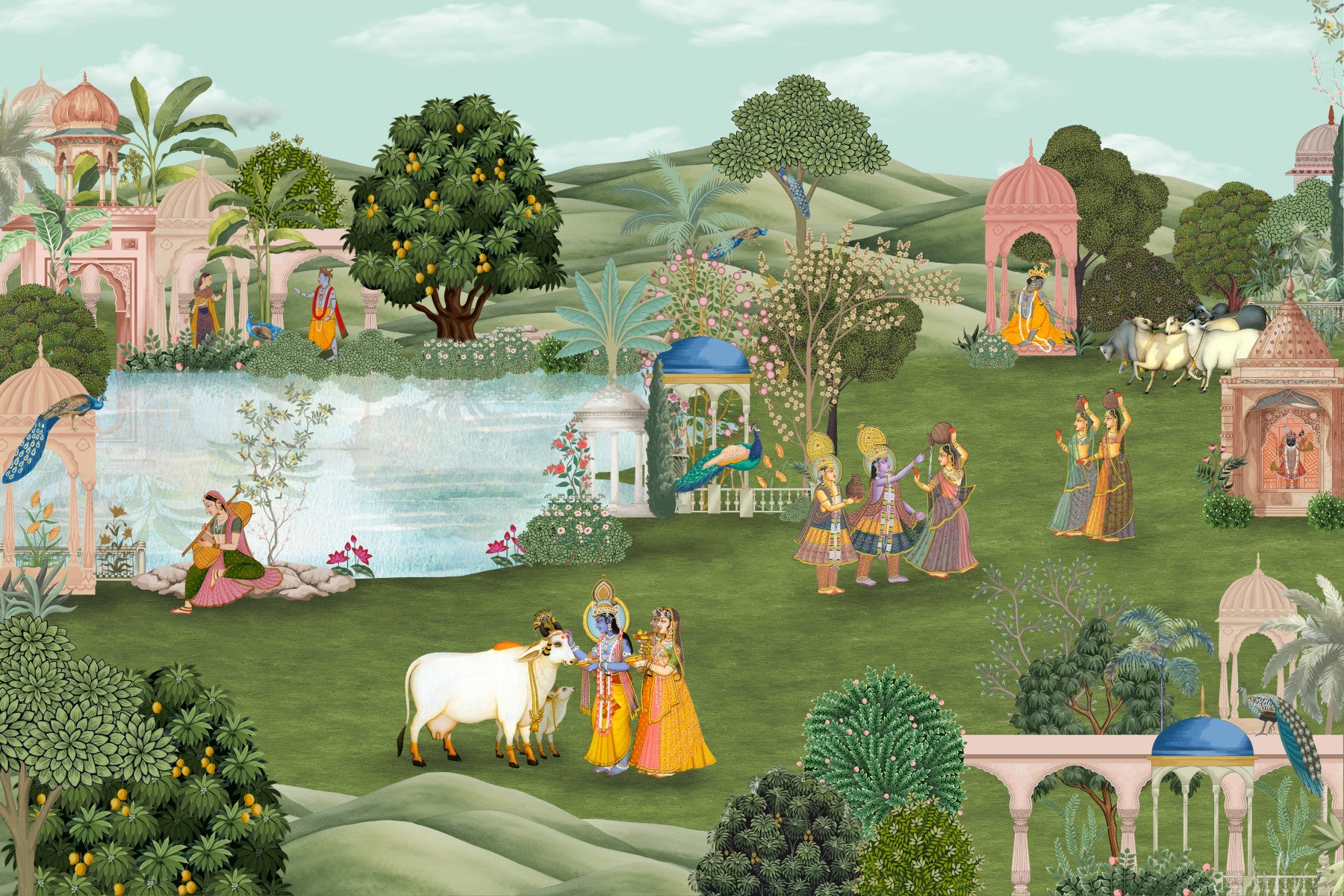 Escape to a tranquil realm with "Pahari Peacocks", where idyllic landscapes meet regal elegance. This captivating design immerses you in a timeless scene inspired by traditional Pahari miniature art. Lush greenery unfolds across rolling hills, dotted with ornate pavilions and serene water features. Majestic peacocks, symbols of beauty and grace, roam freely, adding splashes of vibrant colour to the pastel palette. Figures adorned in traditional attire move through the landscape, hinting at stories of devotion and harmony with nature.