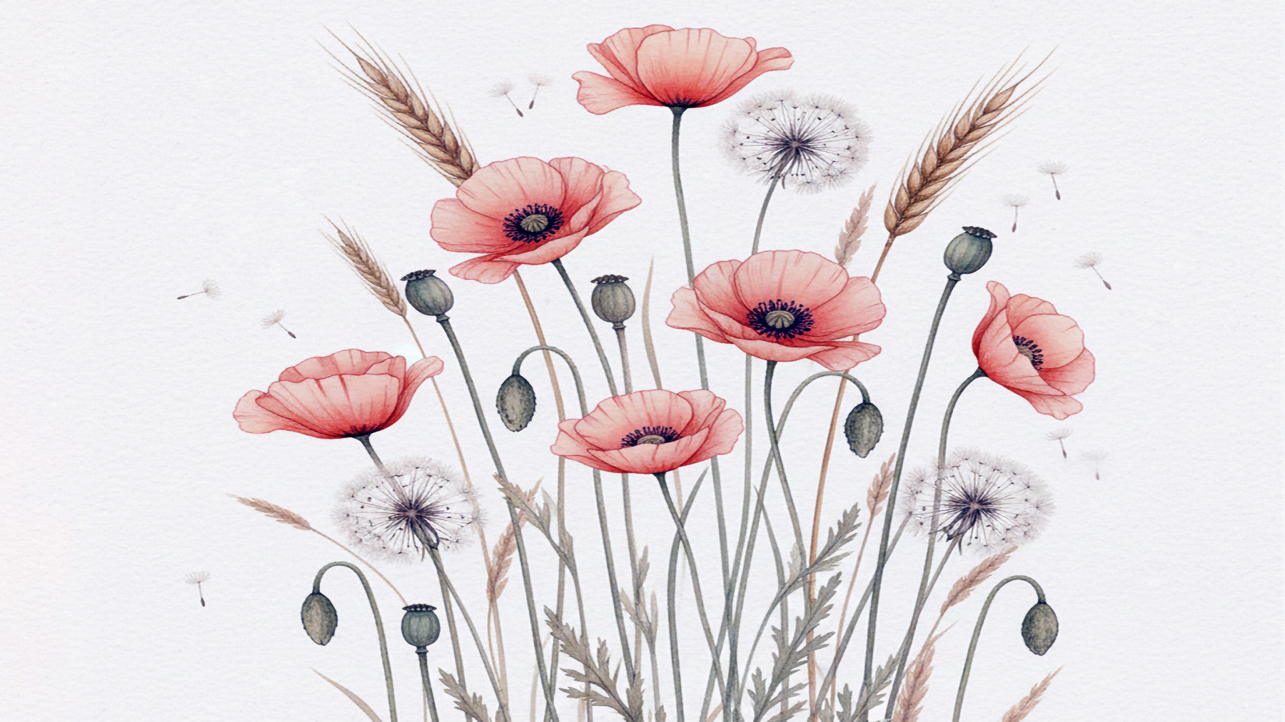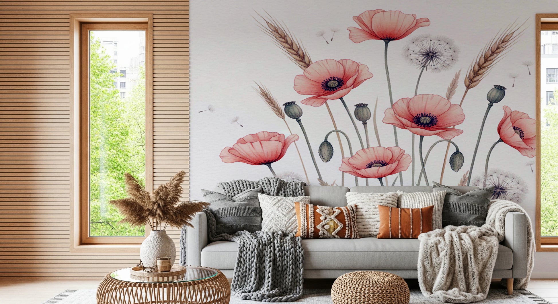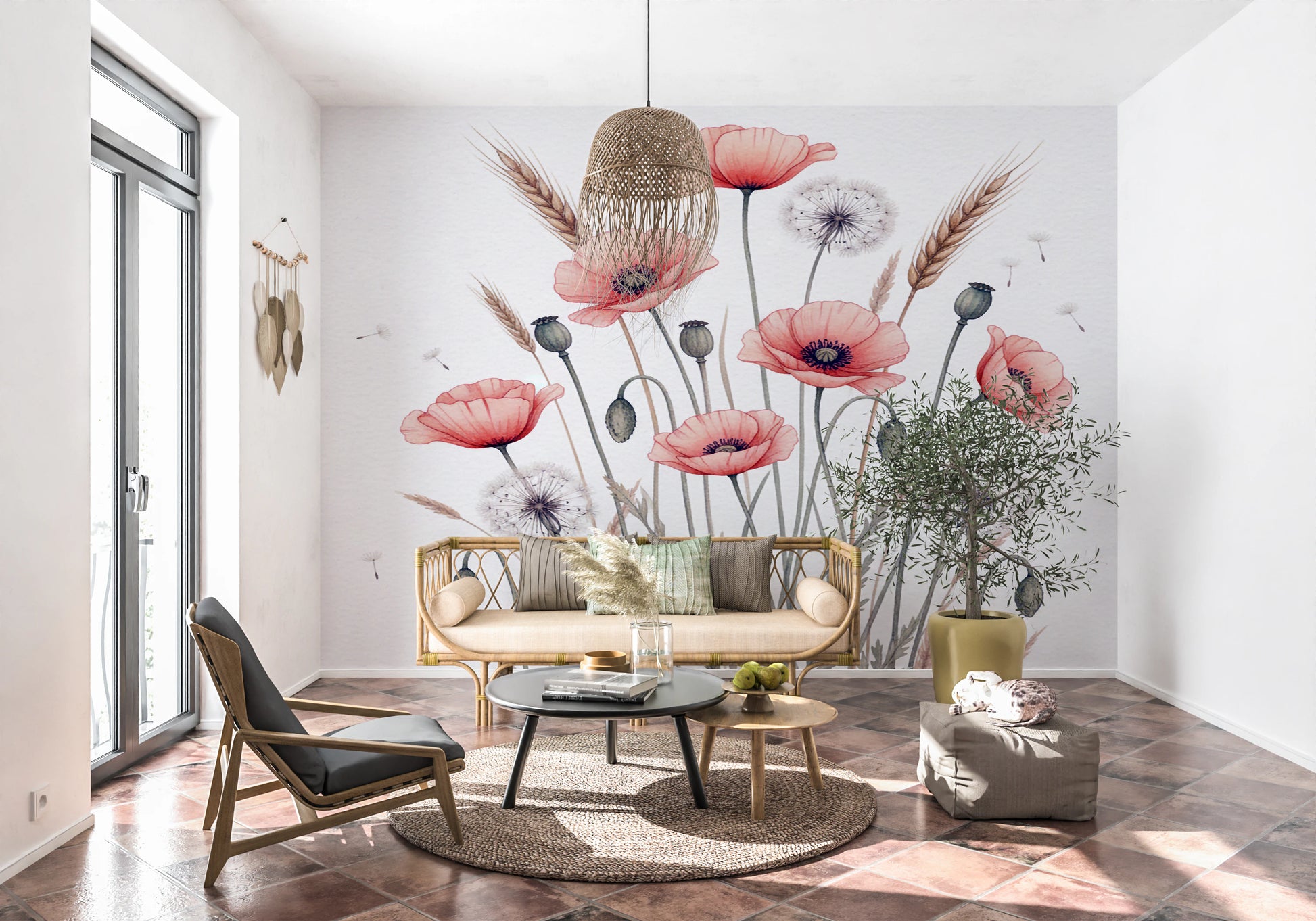 Bring a touch of whimsical charm to your home with this painted poppy meadow wallpaper for walls. The delicate watercolour style showcases soft coral poppies, dandelions, and sprigs of wheat against a clean white background. The gentle colour palette creates a serene and inviting atmosphere, ideal for bedrooms, nurseries, or living rooms. This design offers a fresh, botanical aesthetic that complements both modern and traditional interiors. Transform your walls into a tranquil escape with this beautiful floral pattern.