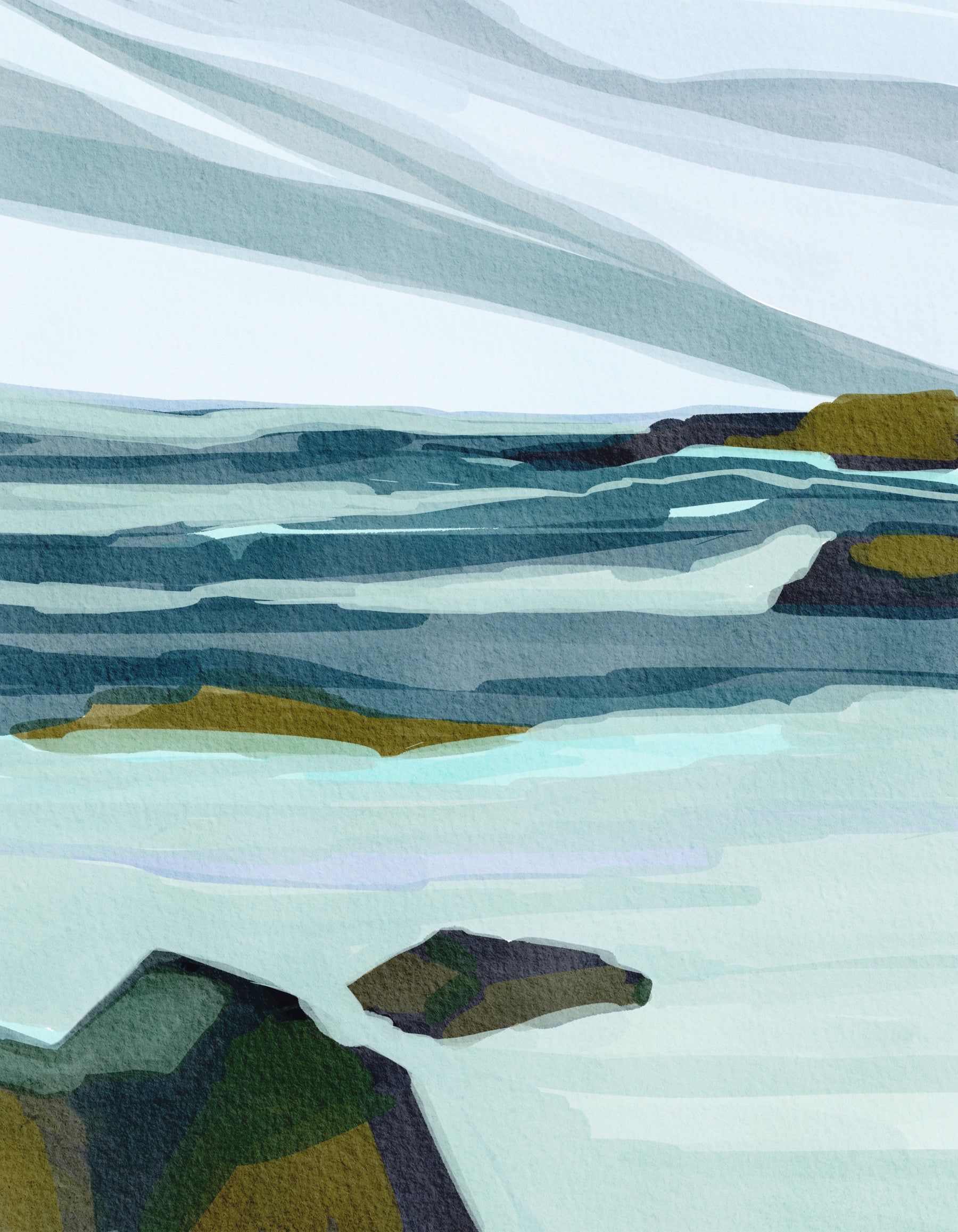Create a restful atmosphere with this painted shoreline design. Featuring gentle brushstrokes and a muted color palette, it captures the essence of a calm seascape. The blues and greens combine to create a soothing atmosphere in any room. Apply this wallpaper for walls to your living room or bedroom and enjoy a tranquil backdrop. Its subtle design enhances interiors without overpowering, making it great for creating a serene, minimalist space.