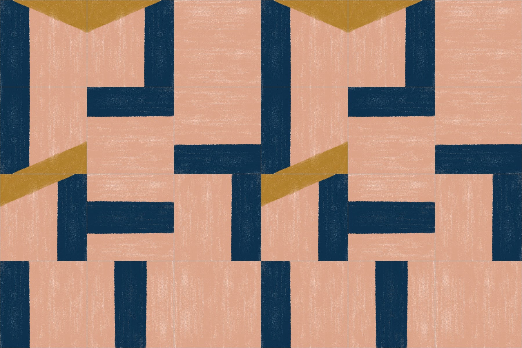 Evoke a sense of handcrafted artistry with Painted Wall Tiles Three a wallpaper design that celebrates the beauty of imperfection. This pattern features an arrangement of seemingly hand-painted tiles in a captivating geometric layout. The rich navy, muted terracotta, and warm mustard hues create a sophisticated yet earthy palette, bringing a touch of understated luxury to any space. Each tile showcases a subtly textured finish, mimicking the look and feel of authentic painted surfaces. The design's deliberate variations in color and brushstroke evoke the charm of a bespoke wall, making it a stunning choice for adding depth and character to your home.