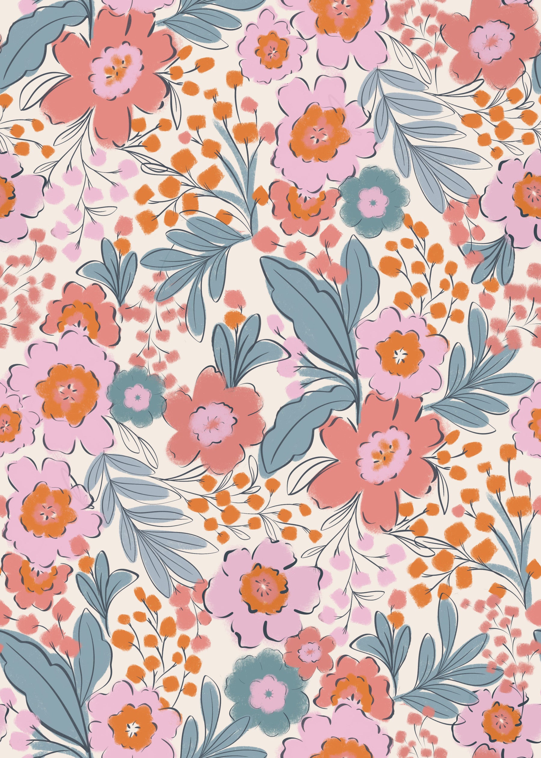 Elevate your decor with 'Painterly Blooms', a vibrant wallpaper design. The image showcases a seamless spread of stylized flowers and leaves in muted tones of pink, orange, and blue. Bold lines and visible brushstrokes define each element. This floral wallpaper for walls makes a statement. It is perfect for a living room or powder room. This design creates an atmosphere of artistic flair and adds warmth to your home. The painterly style gives spaces a fresh and modern feel.