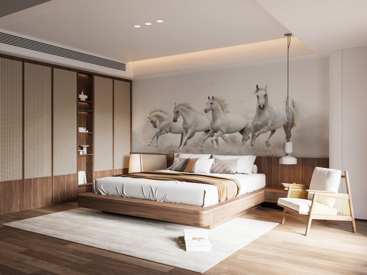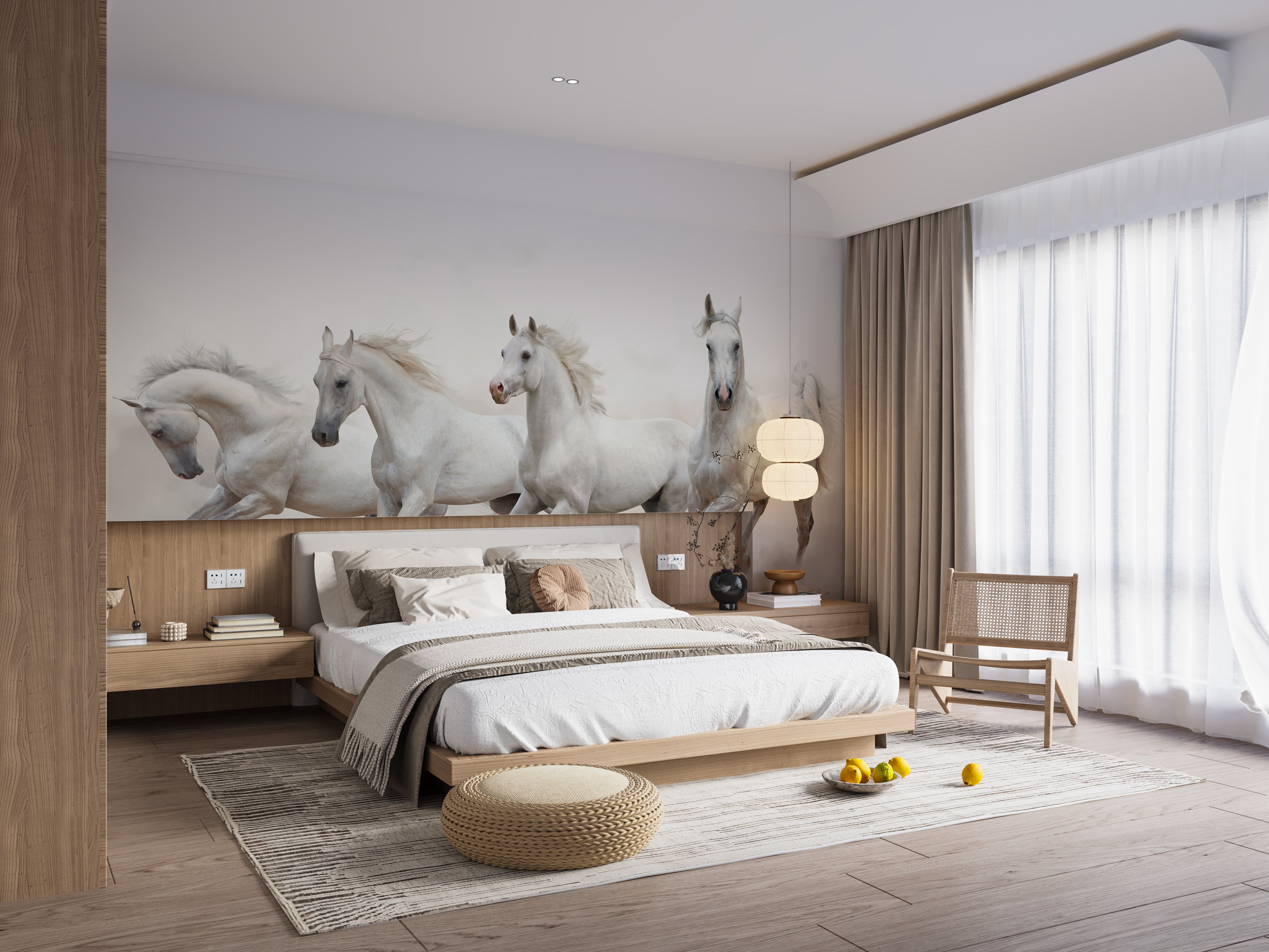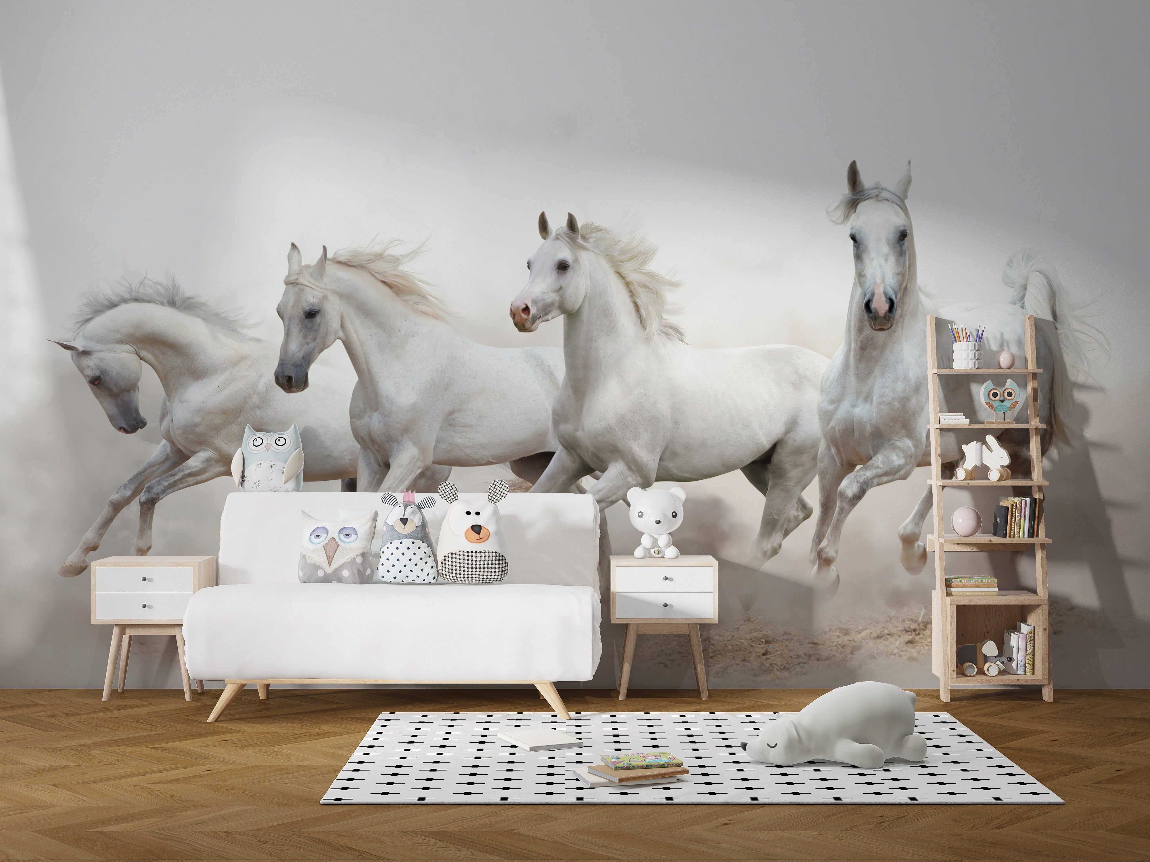 If it's a wild and free vibe you're after, look no further than this running horse mural wallpaper for your living room. Nothing says freedom like the image of a wild Mustang, and this design captures the essence of the untamed spirit perfectly. The bright white backdrop of the wallpaper makes the image stand out, giving your space an eye-catching focal point. Whether you're a horse enthusiast or simply want to bring a touch of wild beauty to your interiors, this horse wallpaper is an ideal choice.