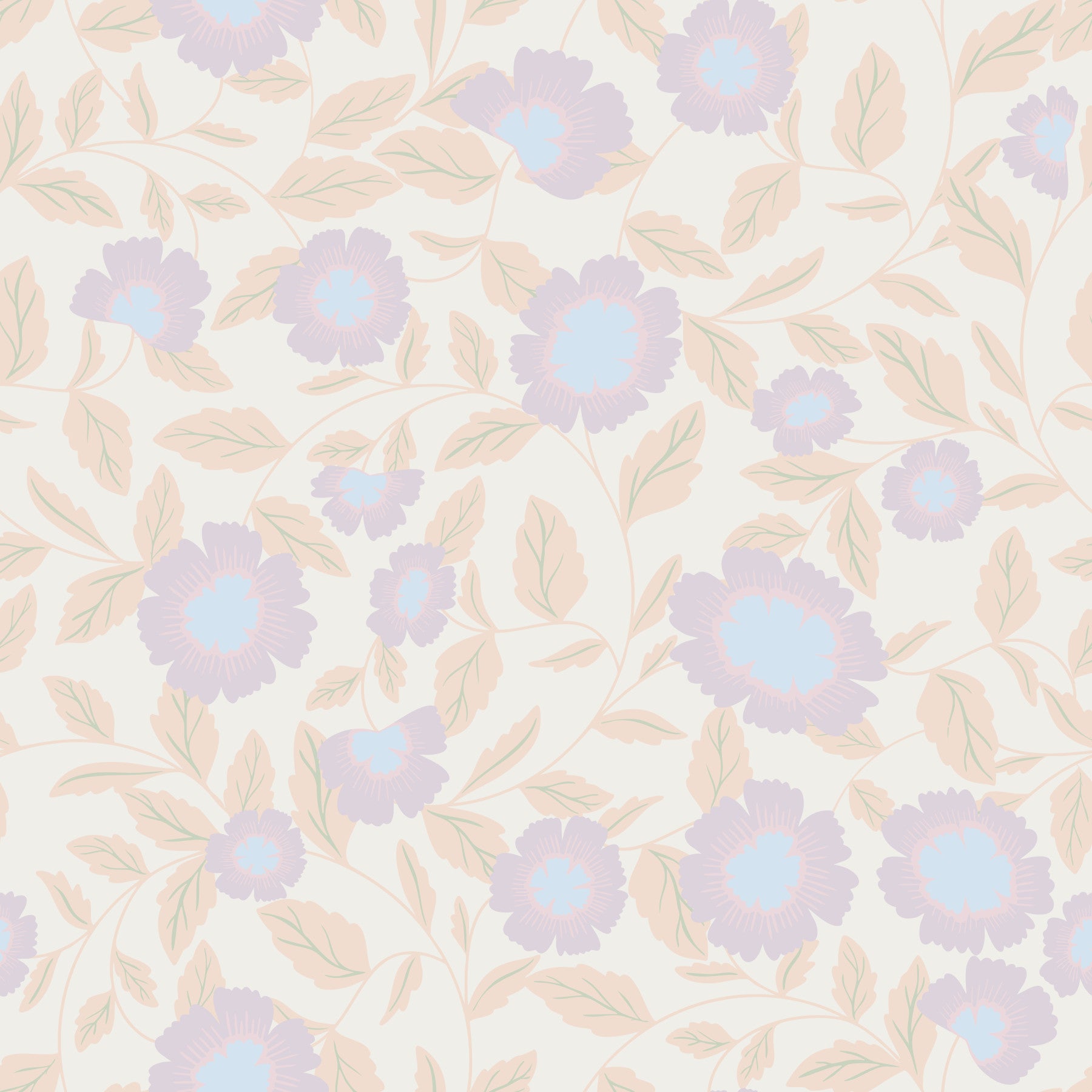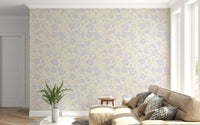Invite calm into your home with this soothing floral design. Gentle pastel hues create an inviting, serene atmosphere. The repeating pattern features stylised flowers in shades of lavender and light blue, complemented by soft peach leaves. This wallpaper for walls enhances interiors with a touch of nature-inspired charm. It's an ideal choice for bedrooms, nurseries, or living spaces where a tranquil environment is desired. Create a space that feels effortlessly peaceful and stylish.