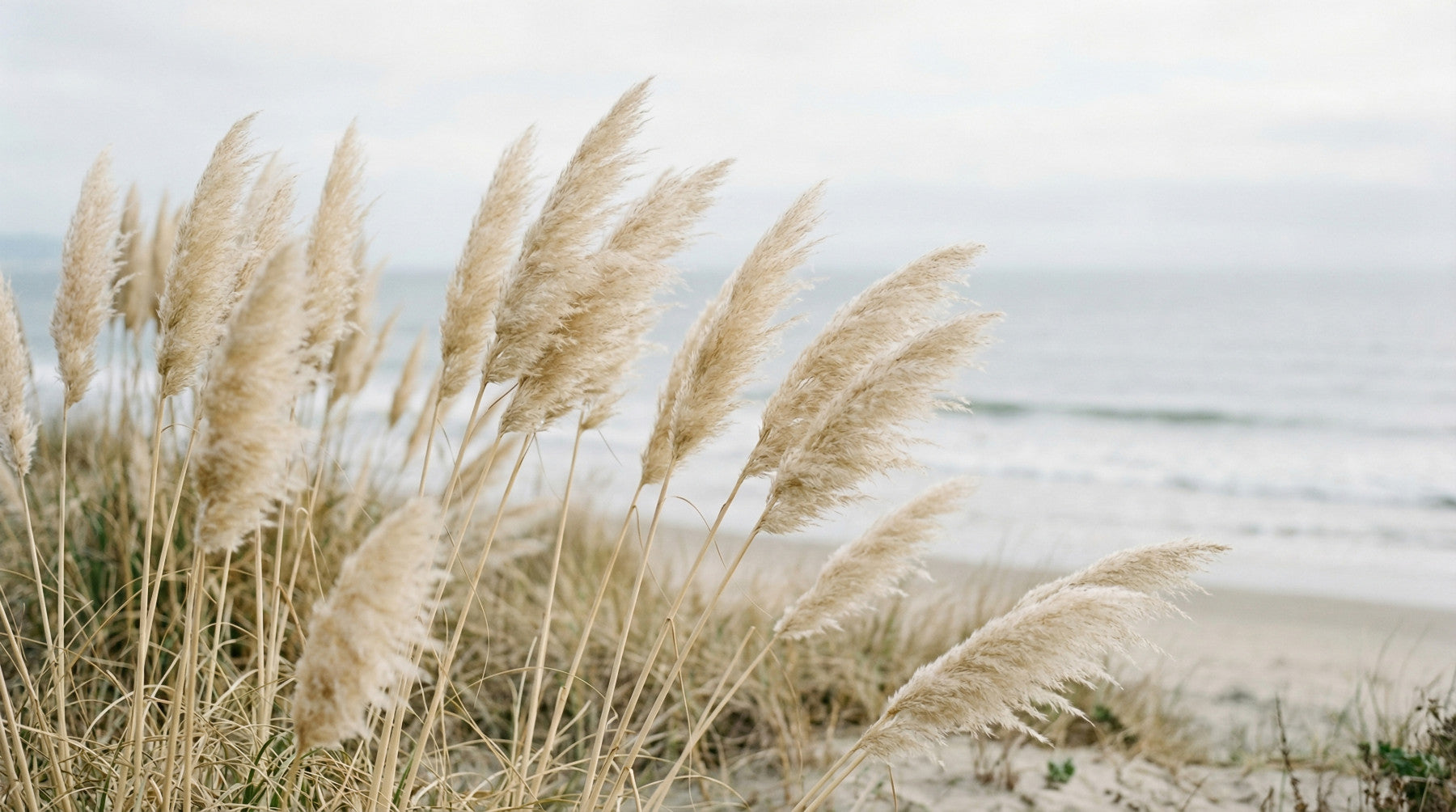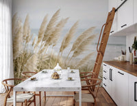 This stunning wallpaper brings tranquil coastal vibes into your home. It features delicate pampas grass swaying gently against a soft, muted seascape. The design captures a serene moment on a sandy dune, perfect for creating a peaceful atmosphere. Its neutral colour palette, with warm beige and creamy tones blending into soft grey-blues, offers subtle elegance. This photographic style wallpaper enhances living rooms, bedrooms, or meditation spaces, providing a natural, calming backdrop. It complements minimalist or bohemian interiors beautifully, adding organic texture and a sense of expansive calm without overwhelming the space. Transform your walls into a serene, natural escape.