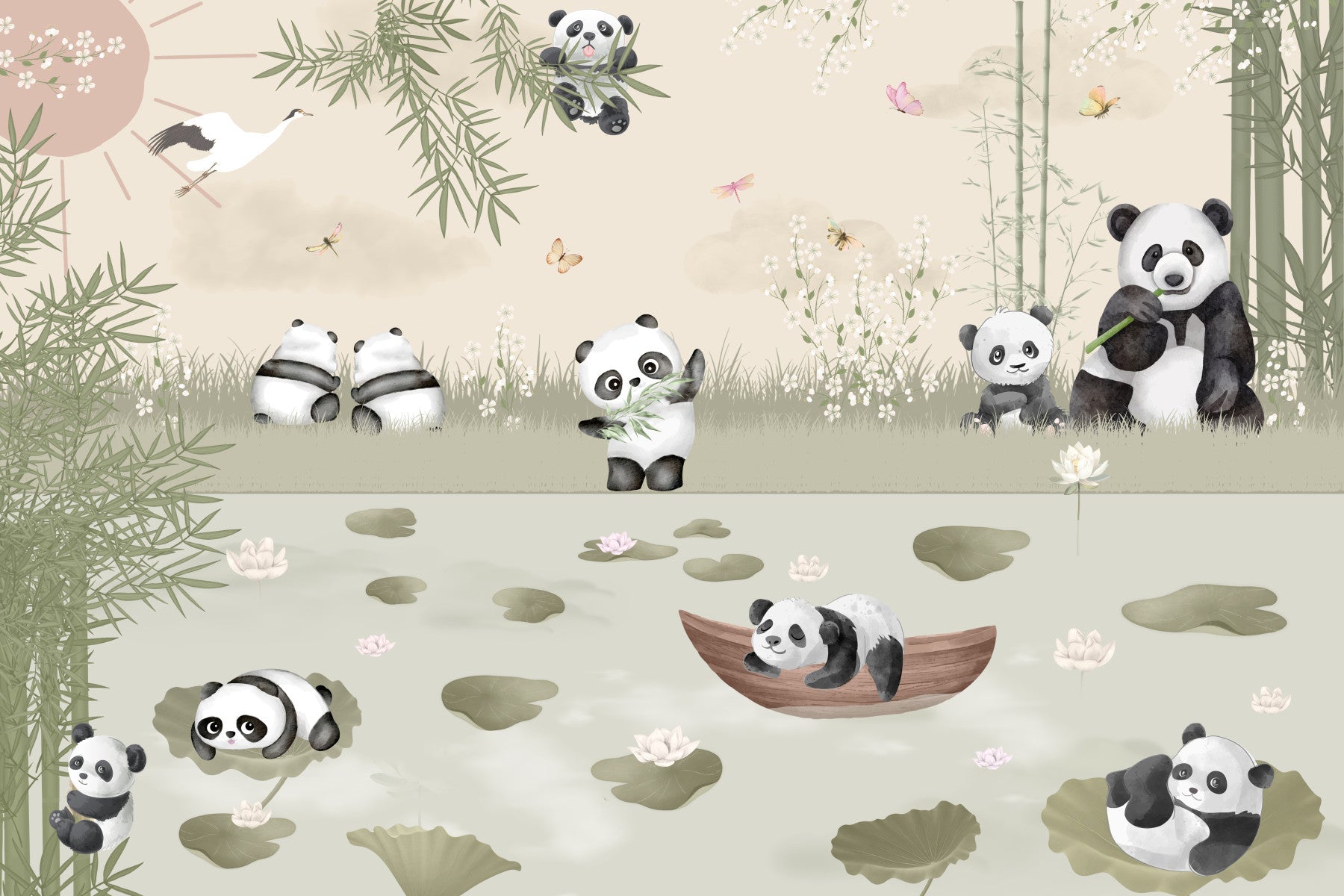 Bring a whimsical touch to any room with this delightful wallpaper for walls. This design showcases adorable pandas enjoying a serene pond with delicate lily pads and bamboo accents. The soft, muted color palette brings a sense of calm and works great in a baby's nursery, a child’s bedroom, or a playroom. It adds a playful yet sophisticated element to interior decoration, fostering an atmosphere of peace.