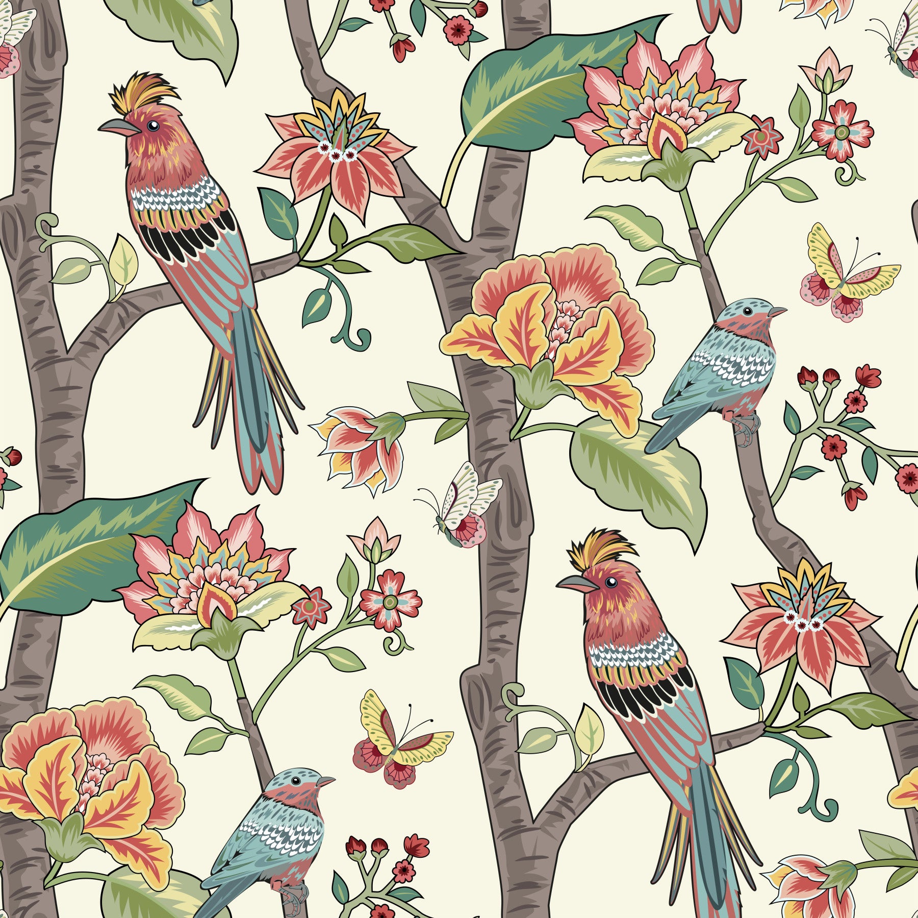 Paradise Perch wallpaper showcasing vibrant avian illustrations intertwined with delicate florals.