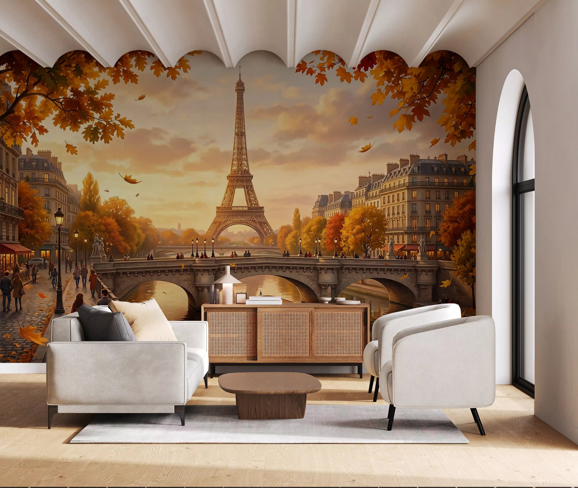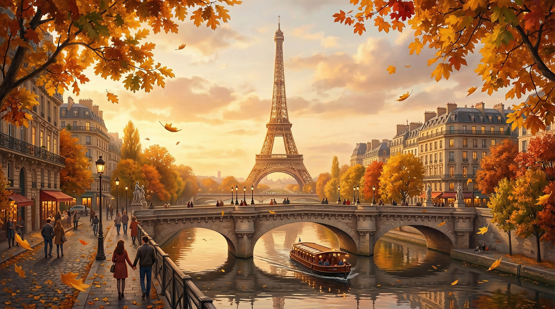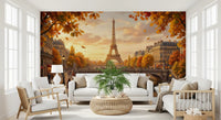 This exquisite wallpaper for walls transports your interior to a romantic Parisian autumn. It showcases the iconic Eiffel Tower, resplendent in the soft glow of golden hour, framed by elegant Haussmannian buildings along the Seine. Lush trees burst with vibrant gold, warm orange, and russet red foliage, their gentle leaves drifting across the charming stone bridge and the tranquil river below. A picturesque boat glides peacefully on the water, reflecting the warm amber hues of the sky. This design creates an inviting, sophisticated ambiance, making it perfect for a living room, dining room, or a serene bedroom. It enhances any space with European charm, autumnal splendour, and a truly picturesque vista.