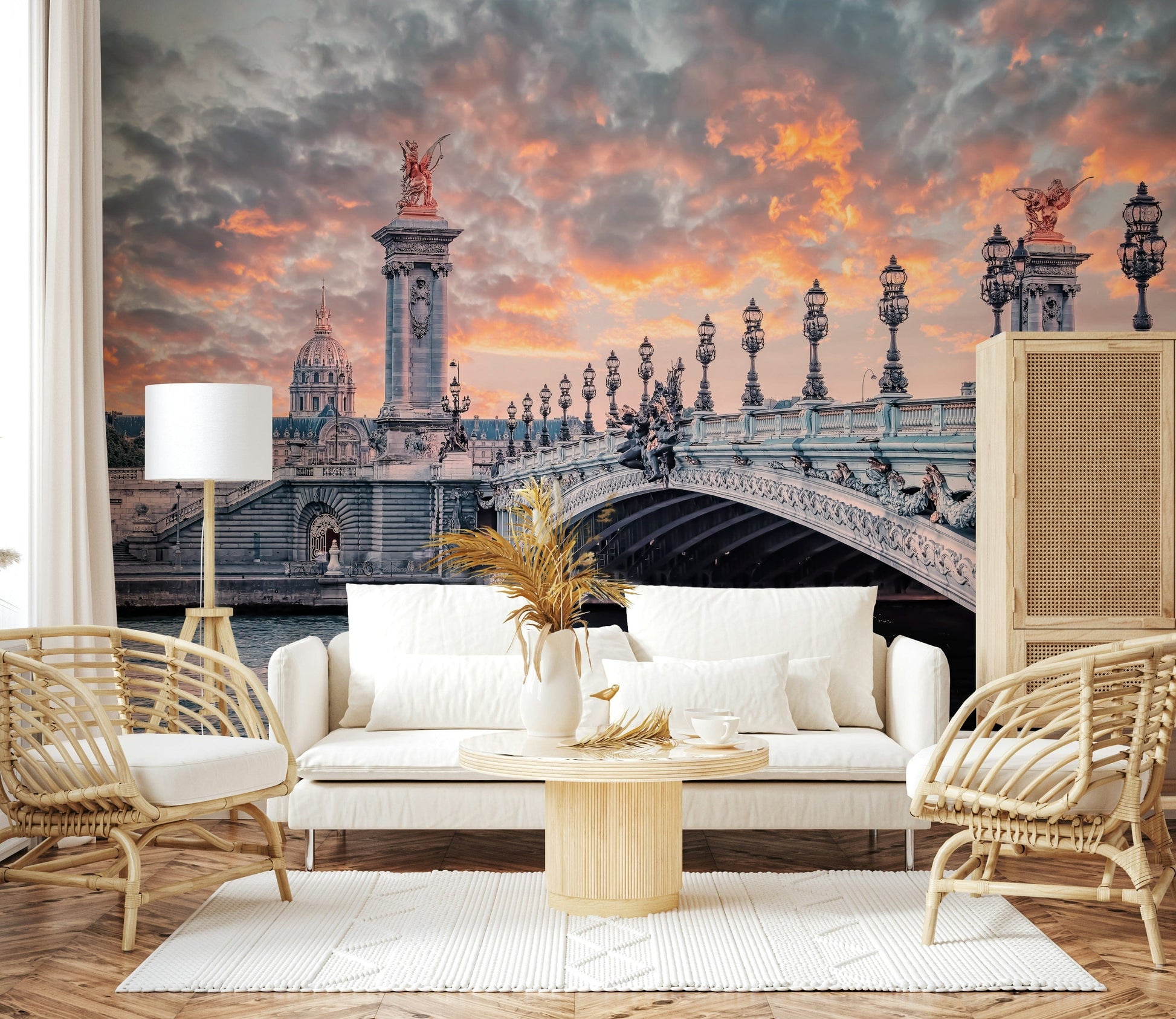 Transform your interior space with this stunning image of the Alexandre III Bridge in Paris. The wallpaper for walls captures the iconic bridge in the warm glow of a sunset. Pink and orange hues paint the dramatic sky, complementing the intricate details of the bridge's sculptures and elegant street lamps. The overall effect is a fusion of architectural grandeur and soft, romantic light. Ideal for adding a touch of Parisian elegance to your living room, bedroom, or entryway, this wallpaper creates a sophisticated and inviting ambience.
