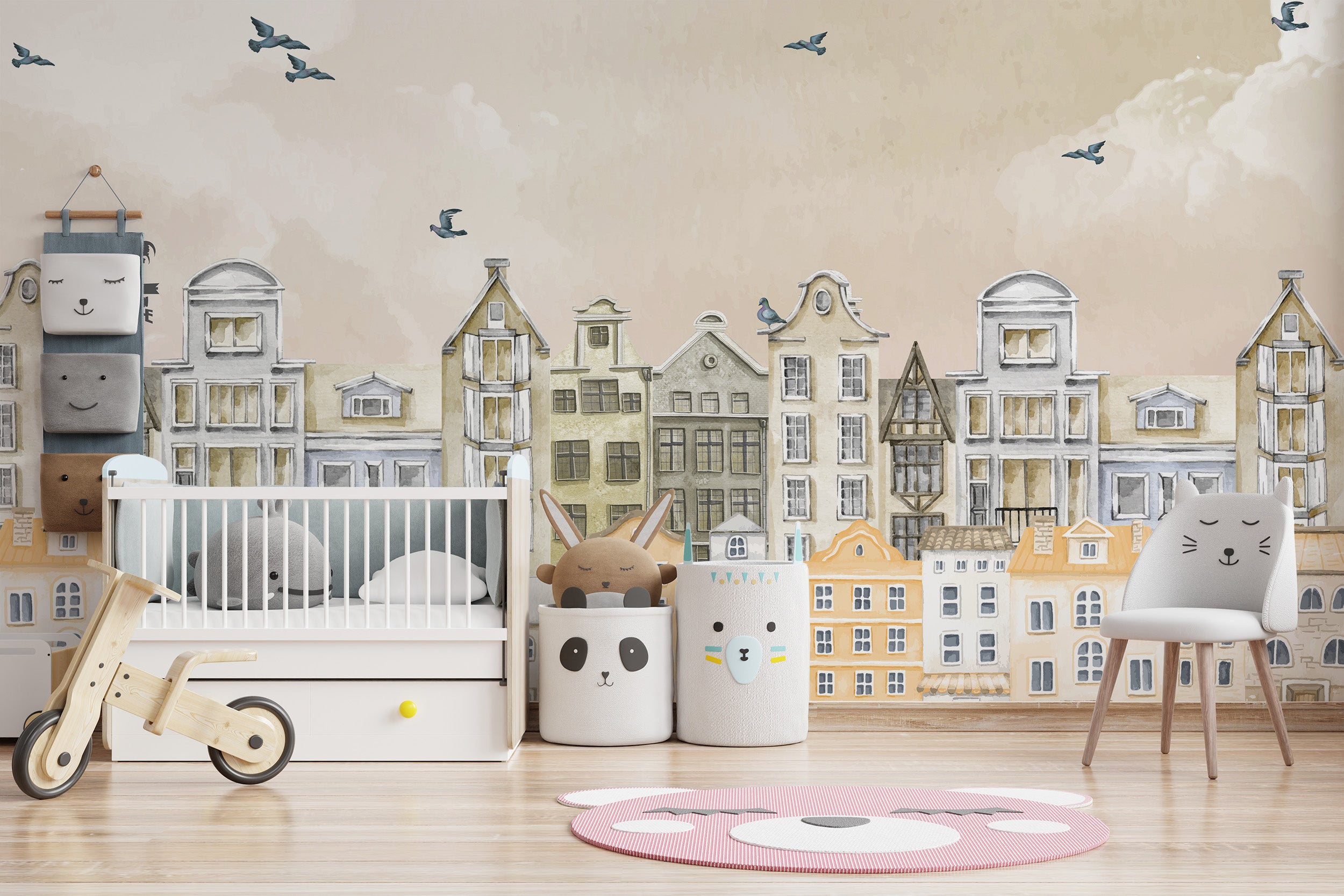 Drift into the romantic lanes of Paris with the Parisian dream wall mural. Picture the flight of pigeons as they dance across a sky brushed with hints of gold. This mural captures the essence of a leisurely stroll through the City of Lights, where each window whispers tales of yesteryear. It's a testament to the timeless beauty of European architecture, lovingly rendered in delicate watercolors. Let these historic buildings become the backdrop of your daily reveries. As day turns to dusk within your room, imagine sipping a café au lait by your very own piece of Paris. It's not just wallpaper it's a portal to a world where every glance holds a story.