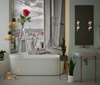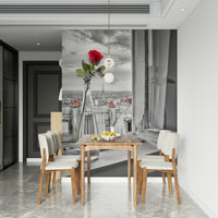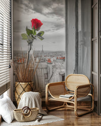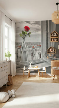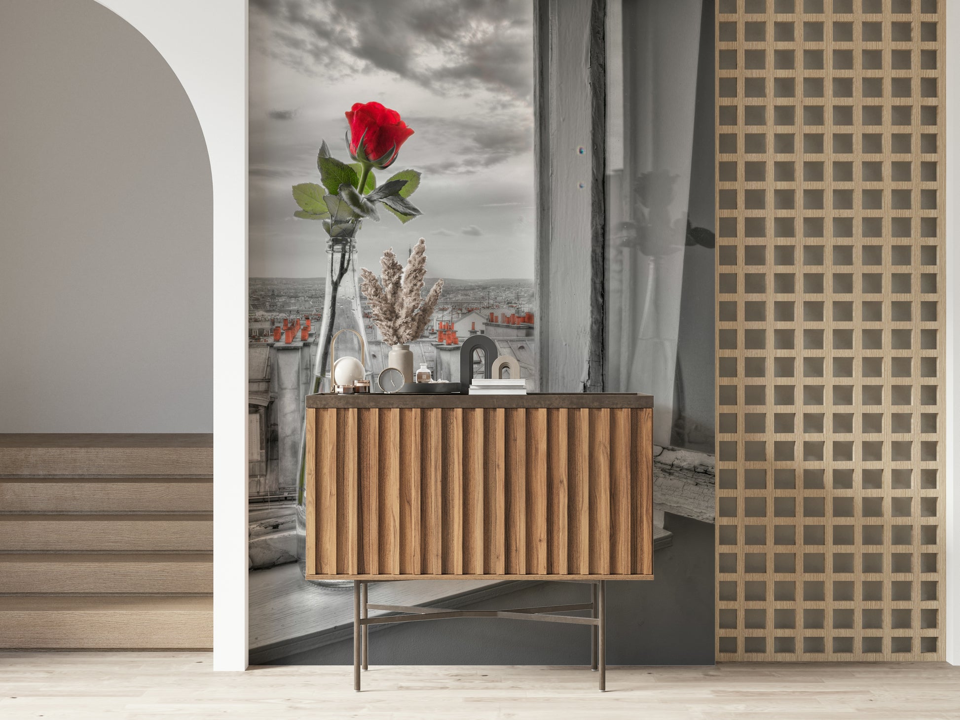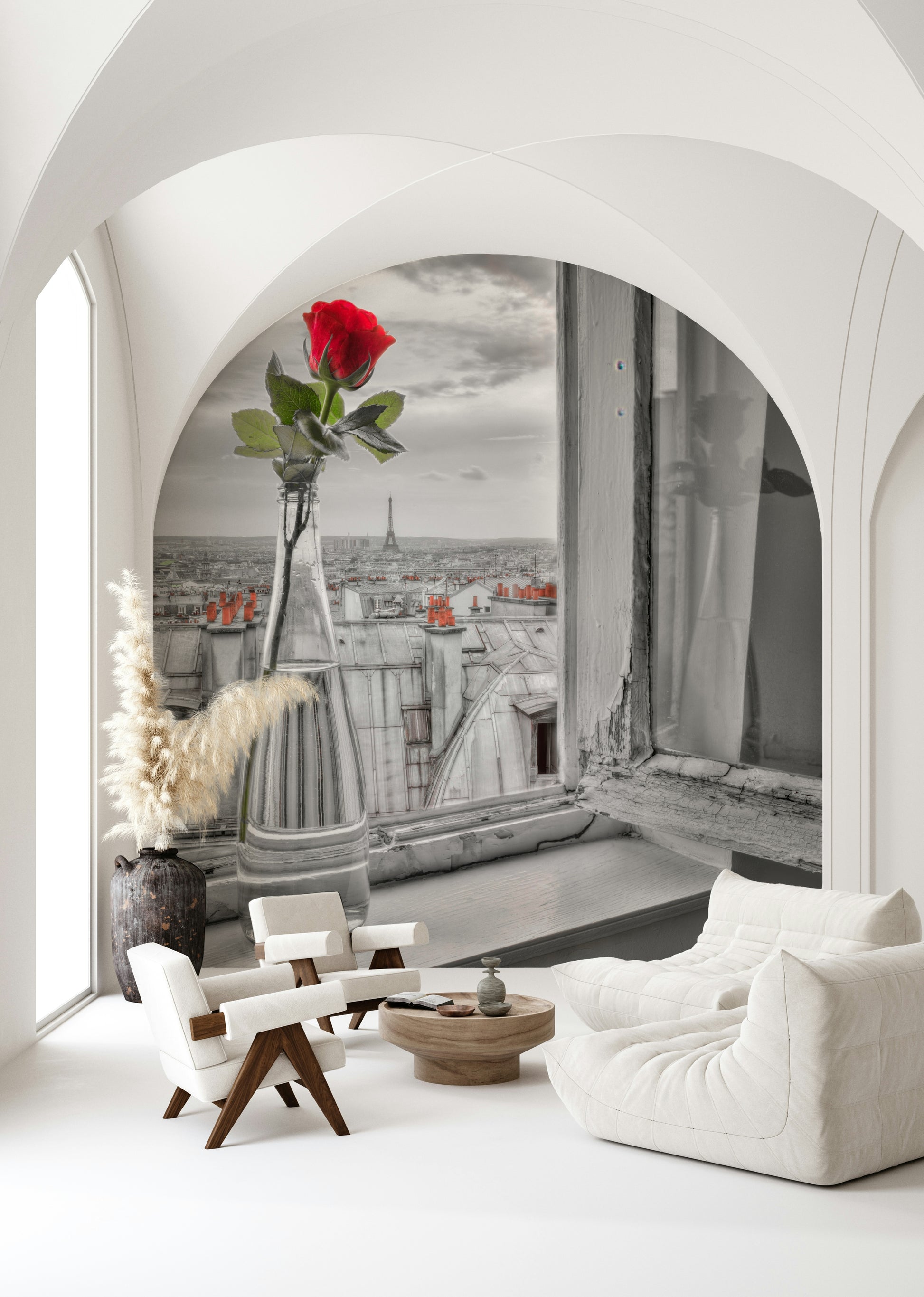 Bring a touch of Parisian charm to your home with this elegant wallpaper. A single red rose pops against the monochrome backdrop of the city skyline, with the Eiffel Tower in the distance. The distressed window frame adds a vintage feel, creating a focal point. This wallpaper for walls offers a stylish and unique scene. Its calming colours and romantic accent make it suitable for bedrooms, living rooms, or hallways. Add some French flair to your space by incorporating this wallpaper, which complements interiors with its balanced design and striking focal point.