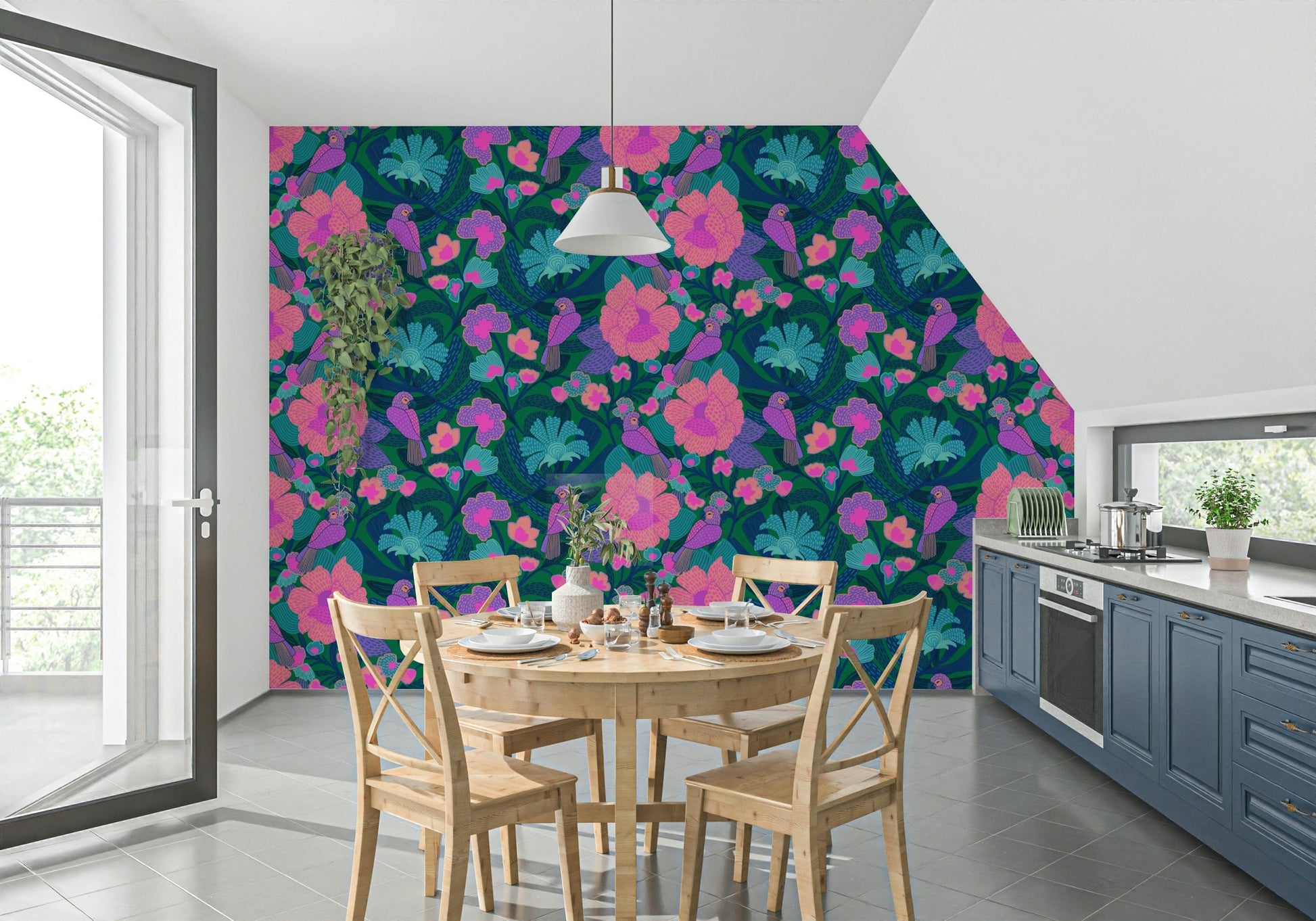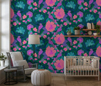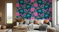 Transform any interior with this lively parrot and floral design. The playful arrangement features vibrant flowers in pink, peach, and turquoise, complemented by whimsical parrots. Bold, stylised leaves in navy and dark green create depth and visual interest. The design brings a touch of the jungle into the home. Introduce this wallpaper for walls to bring energy and charm to living rooms, bedrooms, or children's spaces. It works well as a feature wall or across an entire room, adding a playful, artistic element.