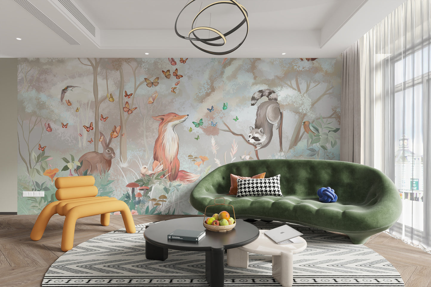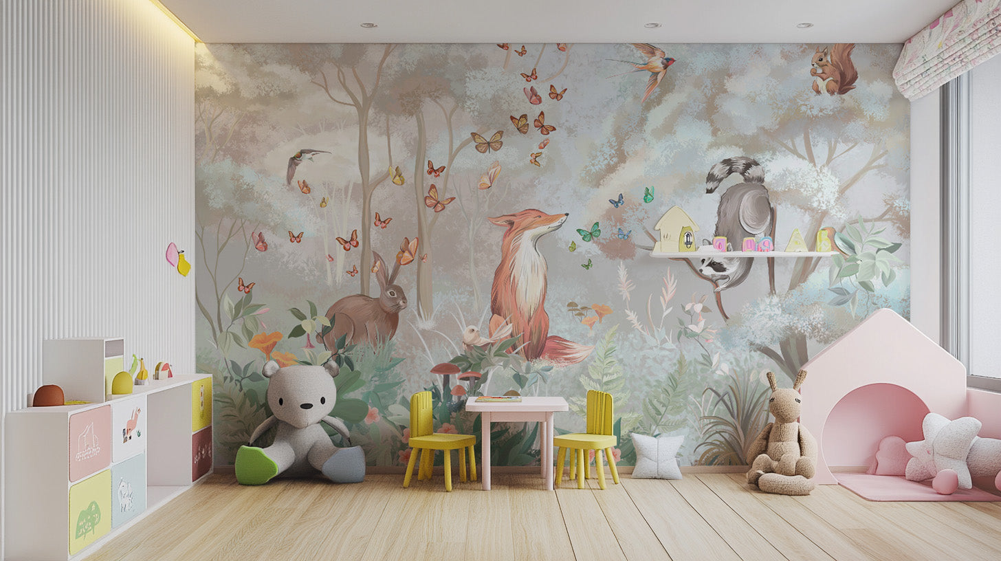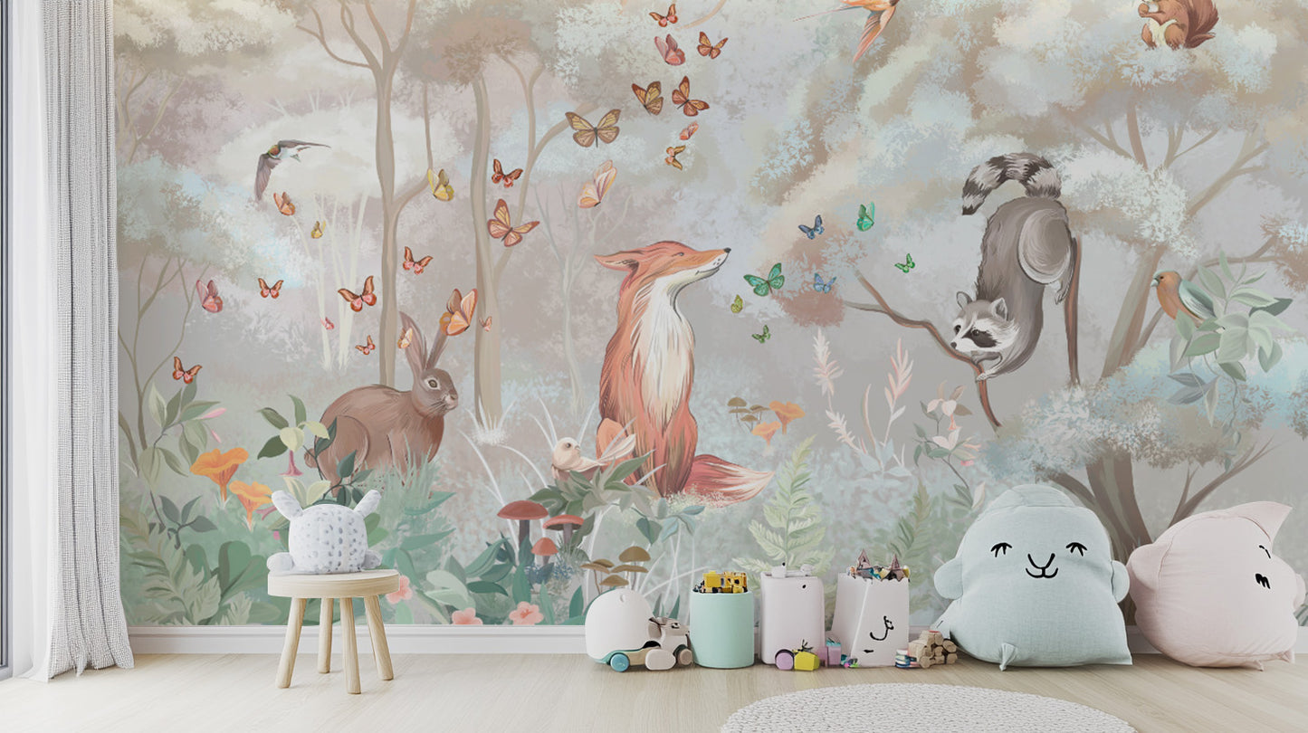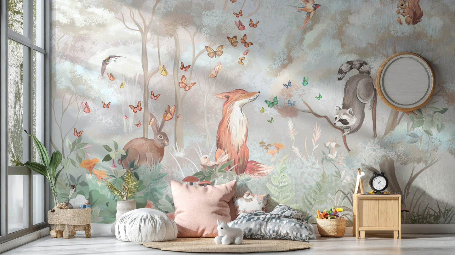 Pastel forest animal wallpaper lets the beauty of nature shine to your walls, featuring foxes, raccoons, rabbits, and a whimsy forest setting; lush greenery, colorful butterflies, and detailed wildlife create a serene as well as play environment. To make it feel soft and inviting, there are pastel tones, thereby making it one of the bedroom, kids, or nature room wallpapers. Let this lovely sight come to life in your abode, plus free delivery