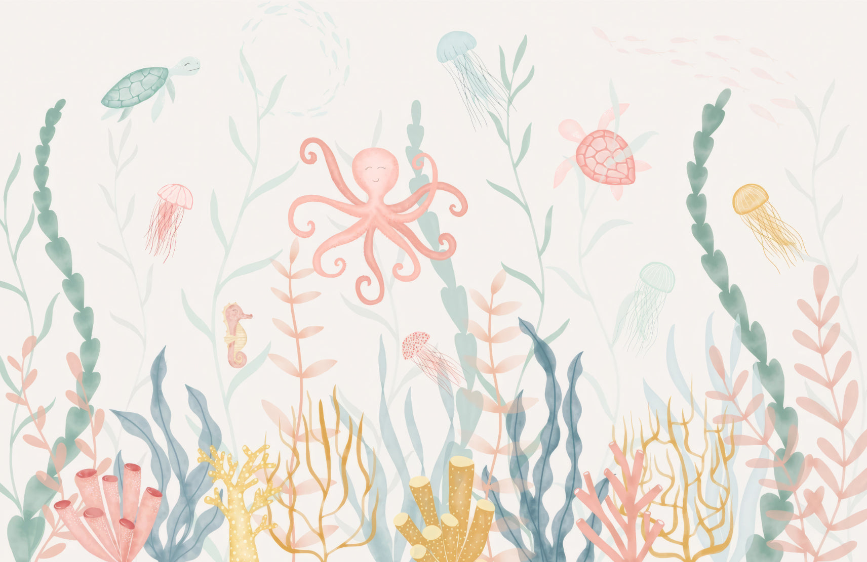 Dive into a gentle seascape with the pastel marine symphony mural, a dreamy addition to any child's room. This kids room wallpaper teems with soft-hued aquatic life, from playful turtles to delicate jellyfish, all rendered in soothing watercolors. A perfect backdrop for bedtime stories and playtime adventures, it wraps young imaginations in a world of oceanic wonders. Each stroke of pastel color brings to life a harmonious underwater tableau, fostering a love for the mysteries of the sea. Ideal for nurturing creativity and learning, this mural is more than just a visual treat; it's a voyage to the depths of the ocean's beauty, without leaving the comfort of home.