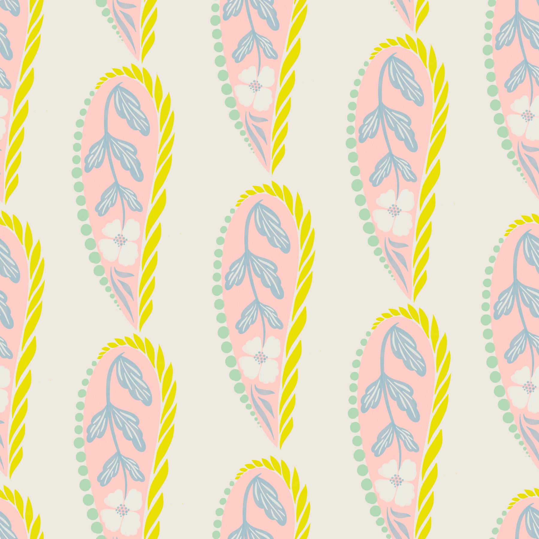 This wallpaper design evokes a sense of serene beauty with its pastel palette and intricate paisley patterns. Delicate floral motifs in soft blues, pinks, and greens are elegantly arranged within a repeating design, creating a whimsical and charming atmosphere. The yellow accents add a touch of vibrancy, while the overall mood remains calm and sophisticated. Perfect for bedrooms, nurseries, or any space where a touch of understated elegance is desired. The seamless pattern ensures a cohesive and visually pleasing look, creating a restful and dreamy ambiance.