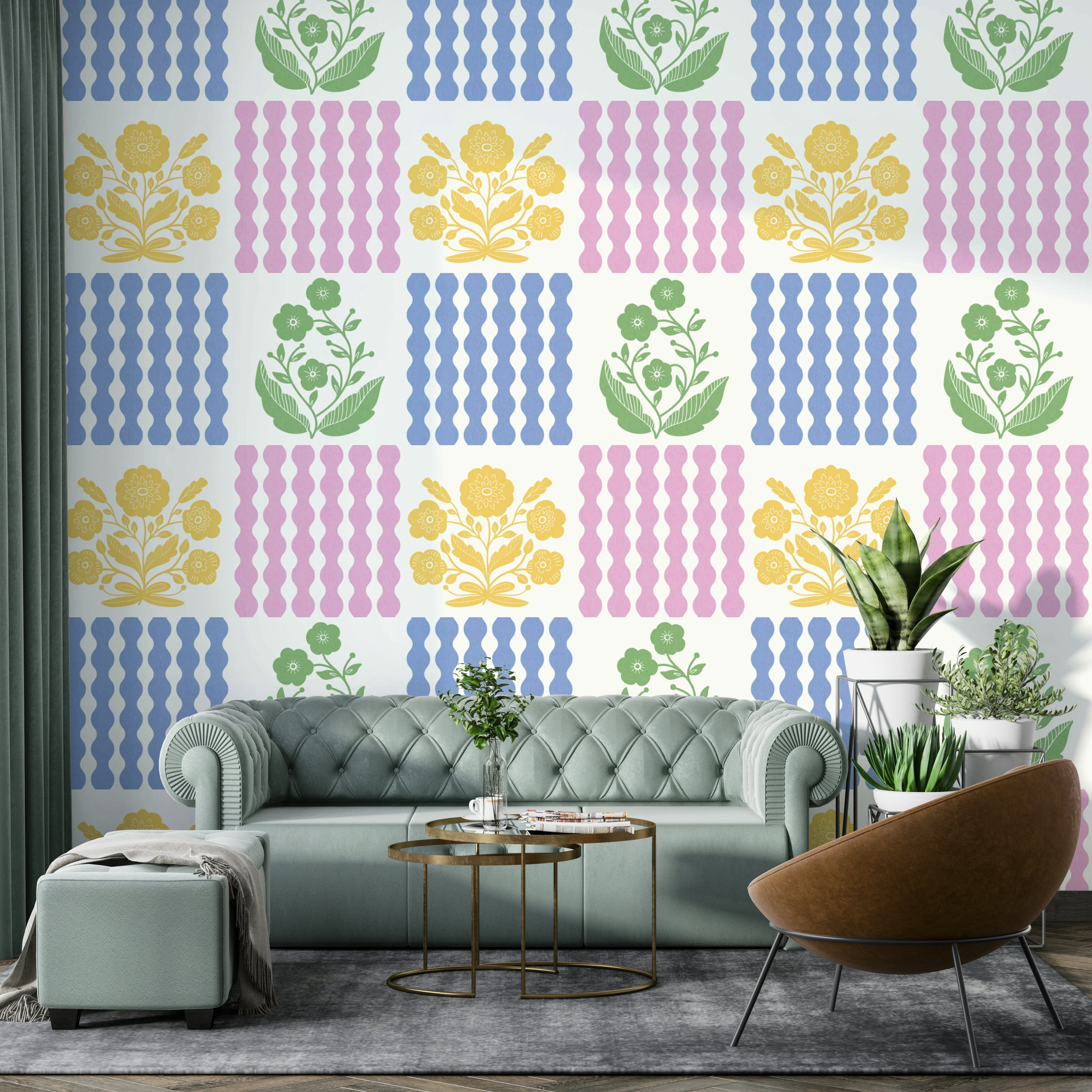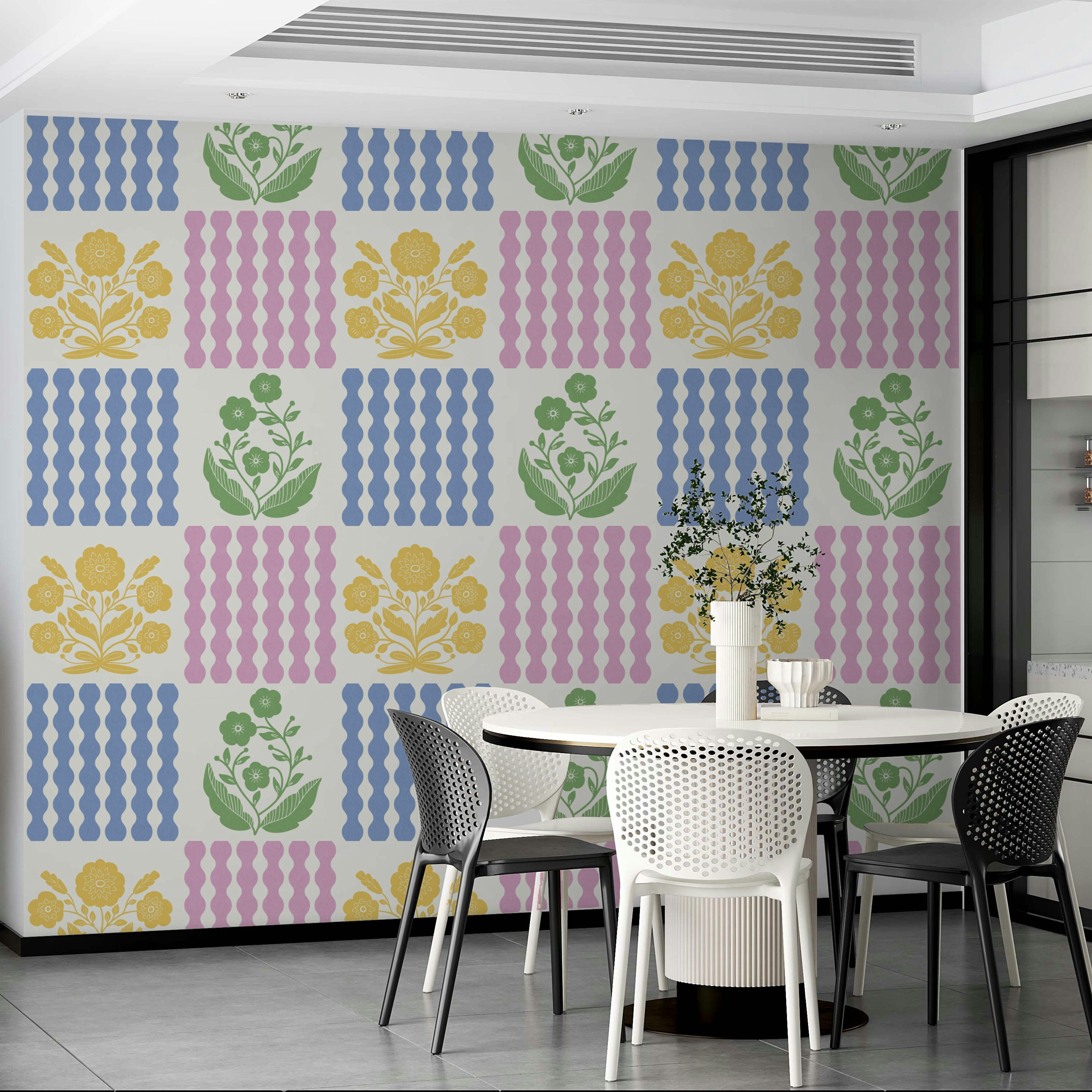 Adorn your rooms with the refreshing charm of this floral geometric design. Notice how whimsical flower bouquets and rhythmic stripes dance across a creamy backdrop, creating a sense of balance and joy. The design uses yellow, pink, green and blue to deliver a visually stunning effect. Install this wallpaper for walls to enhance any living space, from kids' rooms to kitchens. Its balanced colours and lively patterns transform interiors with an optimistic, stylish energy that complements a variety of design styles.