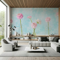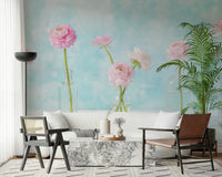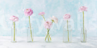 Ranunculus flowers in glass bottles. Transform your space with the delicate charm of "Pastel Ranunculus Glass Decor". This artwork captures the essence of springtime with its soothing pastel palette and refined floral arrangement. The composition features exquisitely rendered ranunculus blooms, their soft pink petals gracefully unfurling against a dreamy, textured backdrop in serene blues and whites. Each flower is individually showcased in vintage-inspired glass bottles, adding a touch of antique elegance and minimalist sophistication. The clear glass enhances the vibrancy of the blooms, allowing their subtle beauty to shine. The clean lines and soft hues create a calming and uplifting atmosphere, perfect for any room seeking a touch of gentle, natural beauty.
