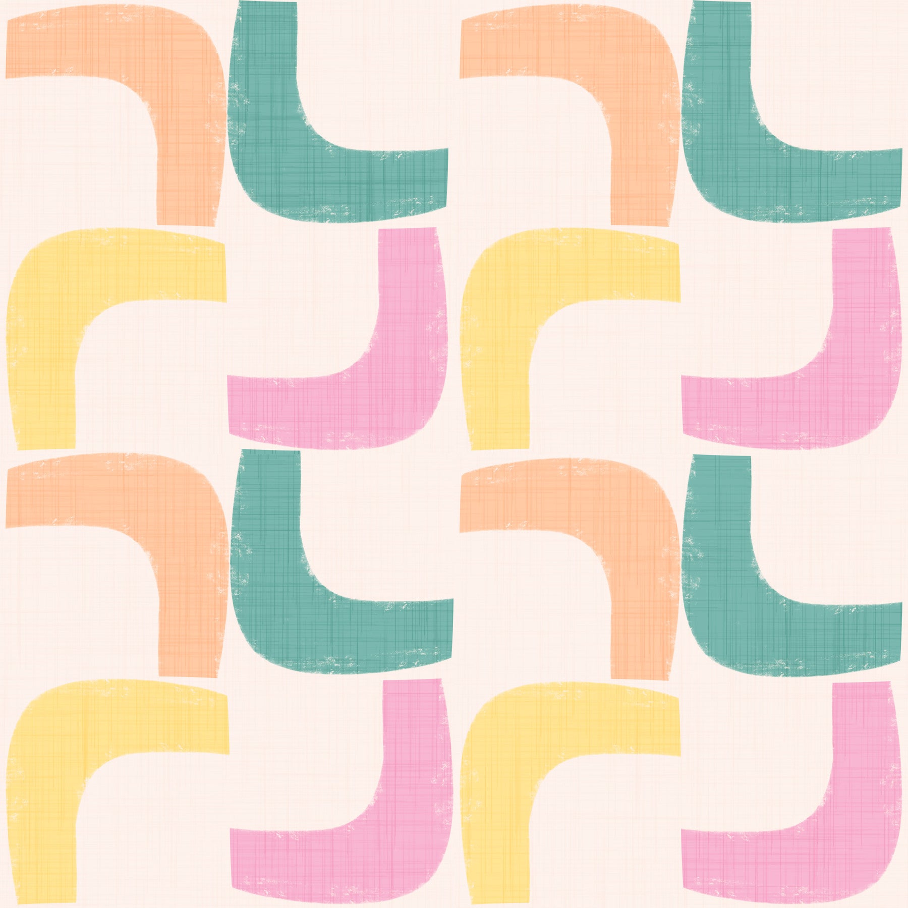 Embrace a nostalgic yet modern aesthetic with this captivating wallpaper. Soft pastel hues of peach, pale yellow, rose pink, and muted teal create a calming, retro vibe. The design features a repeating pattern of stylized boomerang shapes, reminiscent of mid-century modern design elements, each with a subtly textured linen-like finish. This wallpaper brings a touch of vintage charm and sophisticated simplicity to any digital device, offering a pleasing blend of retro and contemporary styles. The soft, muted color palette ensures a tranquil and visually appealing backdrop for your screen.