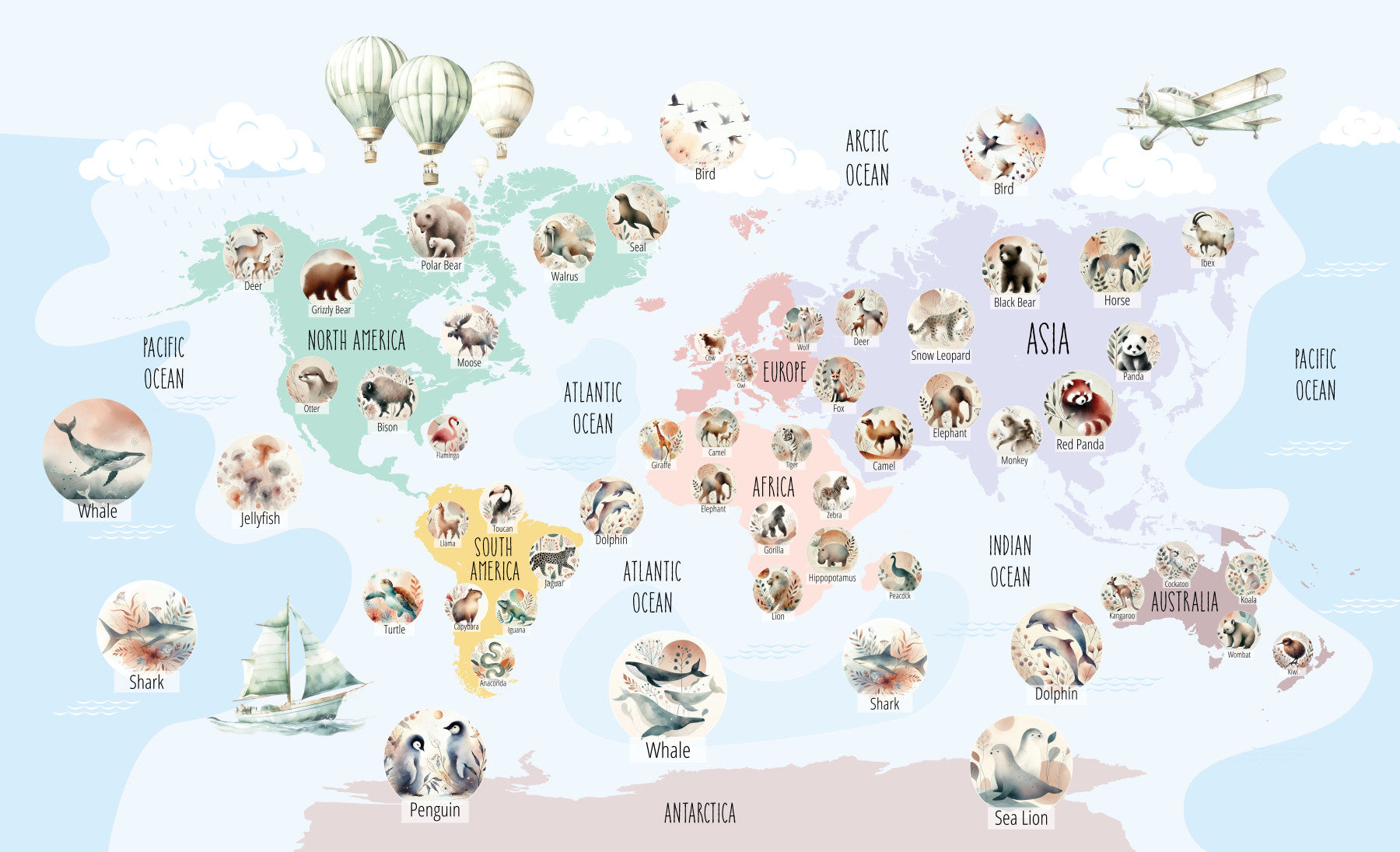Invite wonder with this whimsical world animal wallpaper! Explore a beautifully illustrated map, showcasing animals in their native regions. This wallpaper for walls encourages learning and discovery, ideal for playrooms, children's bedrooms, or a classroom. The gentle pastel tones create a calm atmosphere, while the detailed watercolor renderings offer visual interest. It complements many interiors, adding a playful and educational touch to the space. Inspire your little ones with this charming design.