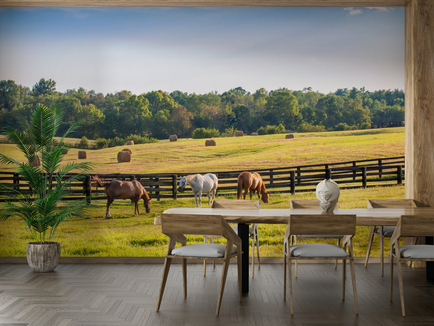 Pastoral Horses Nature Wall Mural captures a quiet countryside scene with grazing horses, rolling fields, and hay bales under an open blue sky. This mural wallpaper brings a grounded and peaceful feel to any space, perfect as wallpaper for walls in living rooms, cabins, or reading nooks. The lush greenery and soft golden light give the wall mural a warm and welcoming tone. Pair it with wooden accents, neutral furniture, or rustic decor. Ideal for those who enjoy calm rural landscapes and farm-inspired views, this wallpaper offers a natural sense of space and quiet charm.