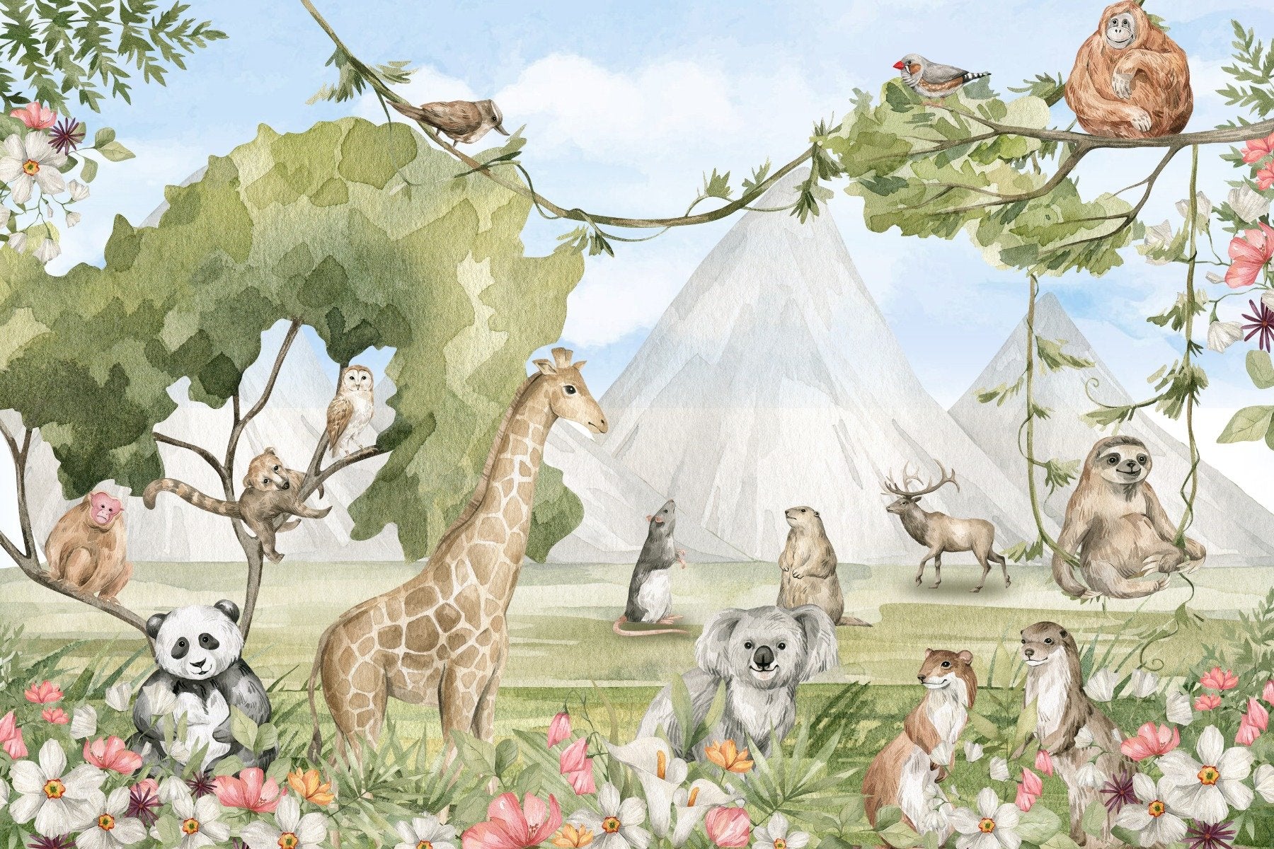 The pastoral paradise wall mural is an exquisite portrayal of nature’s serene bounty, bringing the peach of a sun-dappled meadow into your home. This mural is a masterful collage where each stroke celebrates the diversity of the jungle. As a piece of jungle wallpaper, it is brimming with life from the gentle giraffe to the wise old sloth, it represents a world where every creature plays a role in the tapestry of life. The lush greenery interspersed with vibrant flowers makes it not just a visual delight but a storytelling piece that fuels the imagination. It’s perfect for enveloping a room in the wonders of the wild, making it an ideal animal wallpaper for spaces that crave a connection with the great outdoors. This wall mural is where the whispers of the jungle meet the poetry of the meadows.