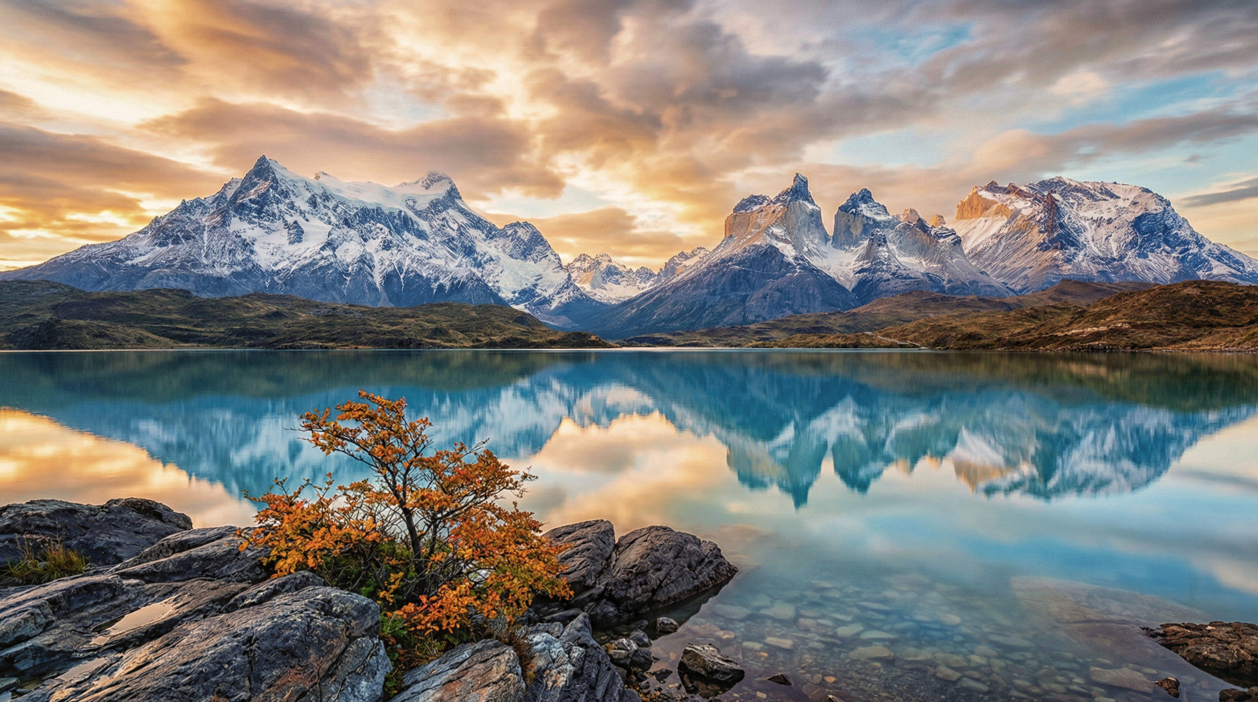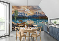 This immersive wallpaper for walls brings the breathtaking beauty of a Patagonian landscape directly into your home. Majestic snow-capped mountains ascend dramatically, their imposing forms reflecting flawlessly in the calm, azure lake below. Vibrant autumn foliage, rich in golden and orange hues, provides a warm counterpoint in the foreground, complementing the cool blues and crisp whites. A dramatic sky, brushed with glowing golden and soft grey clouds, bathes the entire scene in a serene light. This expansive design serves as a captivating focal point in a living room, dining area, or bedroom, inviting tranquility and natural grandeur to infuse your interior spaces.
