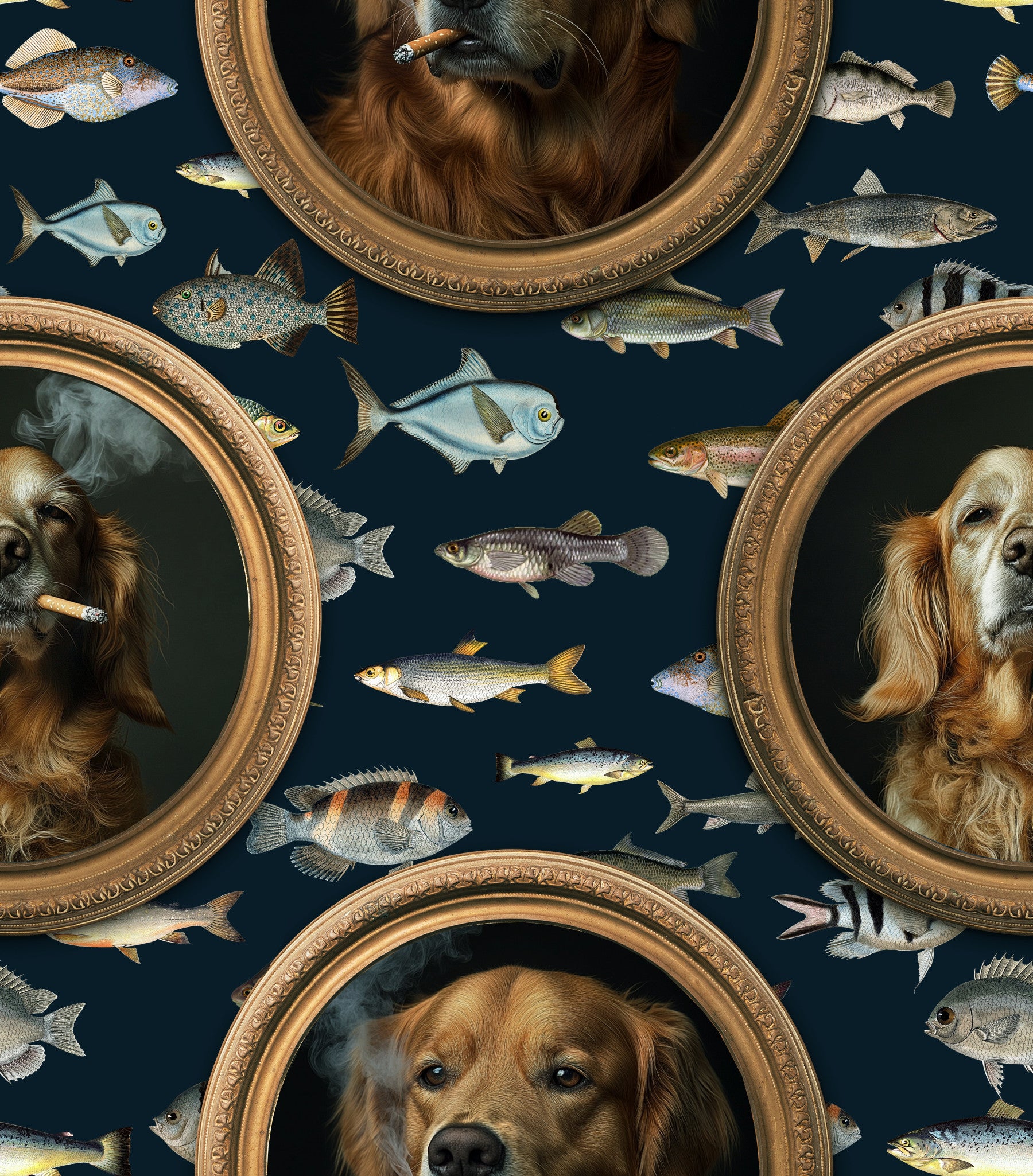 Elevate your interior with this surprising wallpaper for walls featuring canine sophistication alongside vintage aquatic illustrations by Uta Naumann. Golden frames around dapper dog portraits contrast with a patterned gathering of various fish species. The deep background and vintage art style blend to create an eclectic gallery wall effect. This memorable design is perfect for an office, hallway, or even a bold dining room. It merges elements of classic art with a playful twist, bringing a refined yet humorous statement to your space.