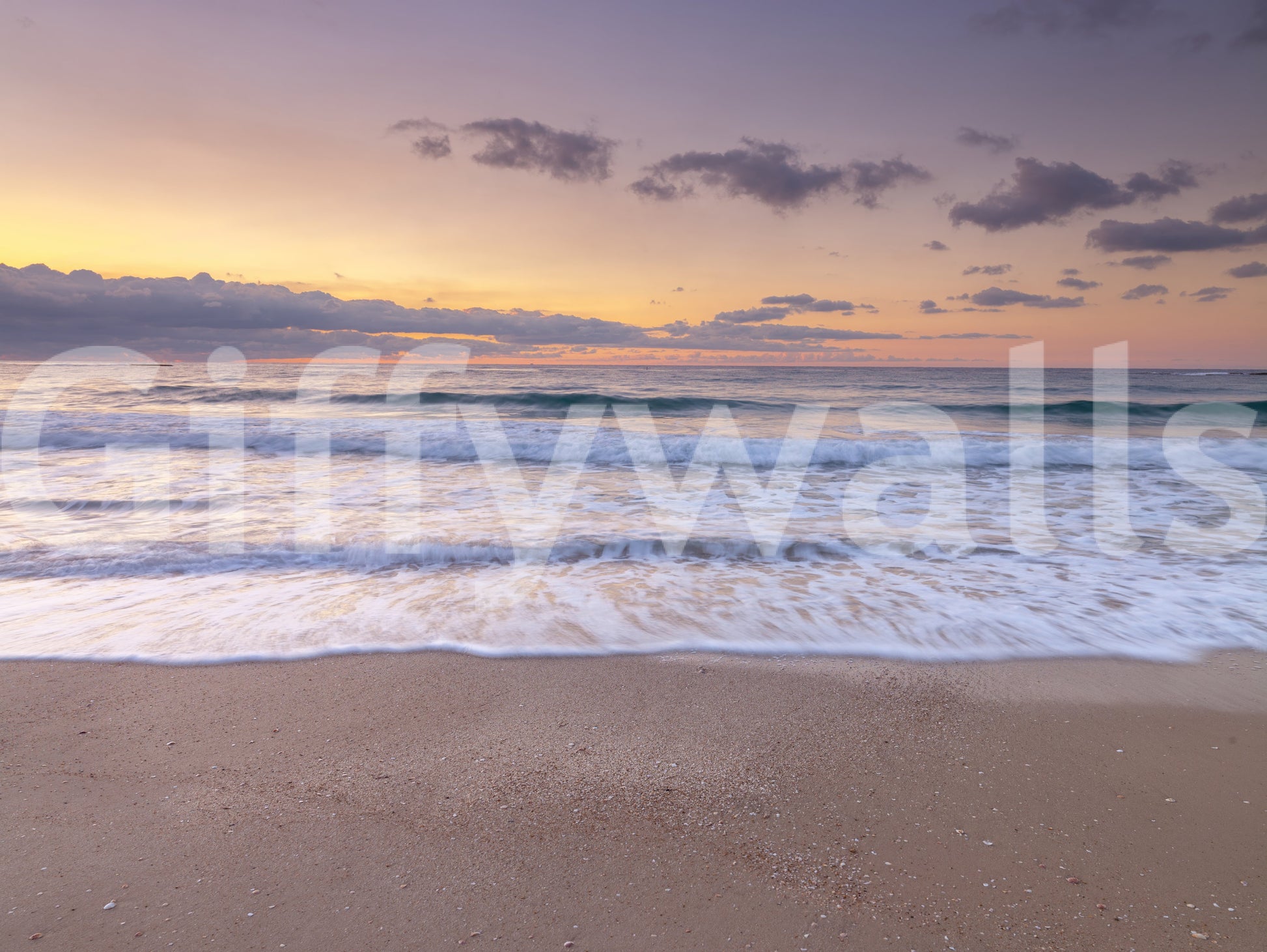 Evening view of beautiful beach in Israel. Transform your space into a serene coastal haven with "Peace at the Beach." This evocative image captures the tranquil beauty of a shoreline bathed in the soft hues of dawn or dusk. Gentle waves caress the sandy beach, their foamy edges creating a soothing visual rhythm. The sky, a canvas of delicate pastel shades – lavender, peach, and gold – adds a touch of dreamy elegance to the scene. This panoramic view instills a sense of calm and escape, transporting you to a place where the only sounds are the gentle lapping of the waves and the whisper of the breeze. Invite the calming essence of the ocean into your home with this scenic view that promises to inspire relaxation and a sense of peaceful contemplation, creating a focal point in any room.