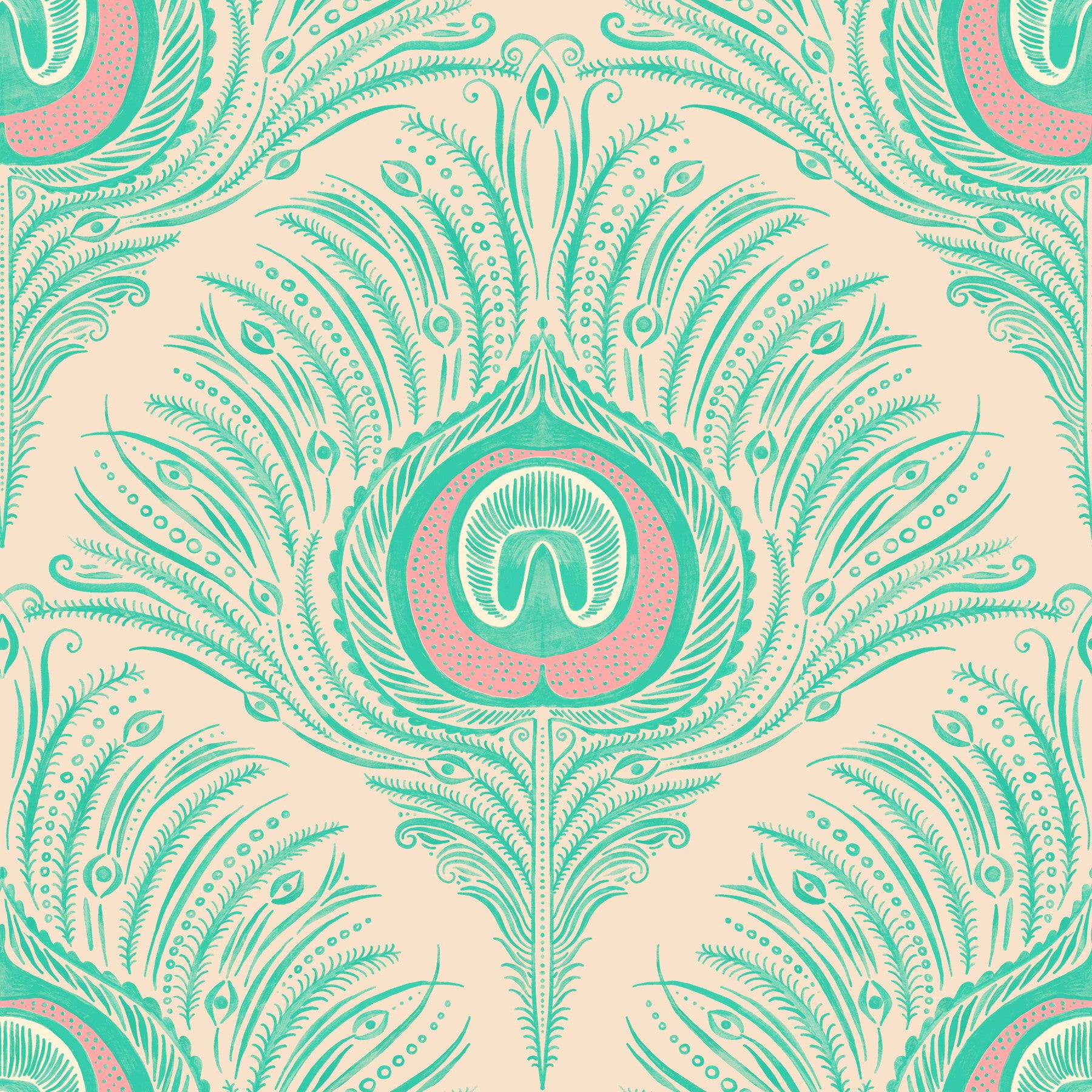 Embrace the elegance of 'Peacock Plume,' a captivating wallpaper design. Intricate teal and blush pink stylized feathers create a mesmerizing pattern against a soft beige backdrop. The design evokes a sense of serene sophistication, featuring meticulously rendered details in a whimsical art style. Each feather boasts unique, eye-like embellishments, adding a touch of mystique and intrigue to this beautifully balanced, symmetrical composition. Perfect for adding a touch of refined artistry to any digital device.