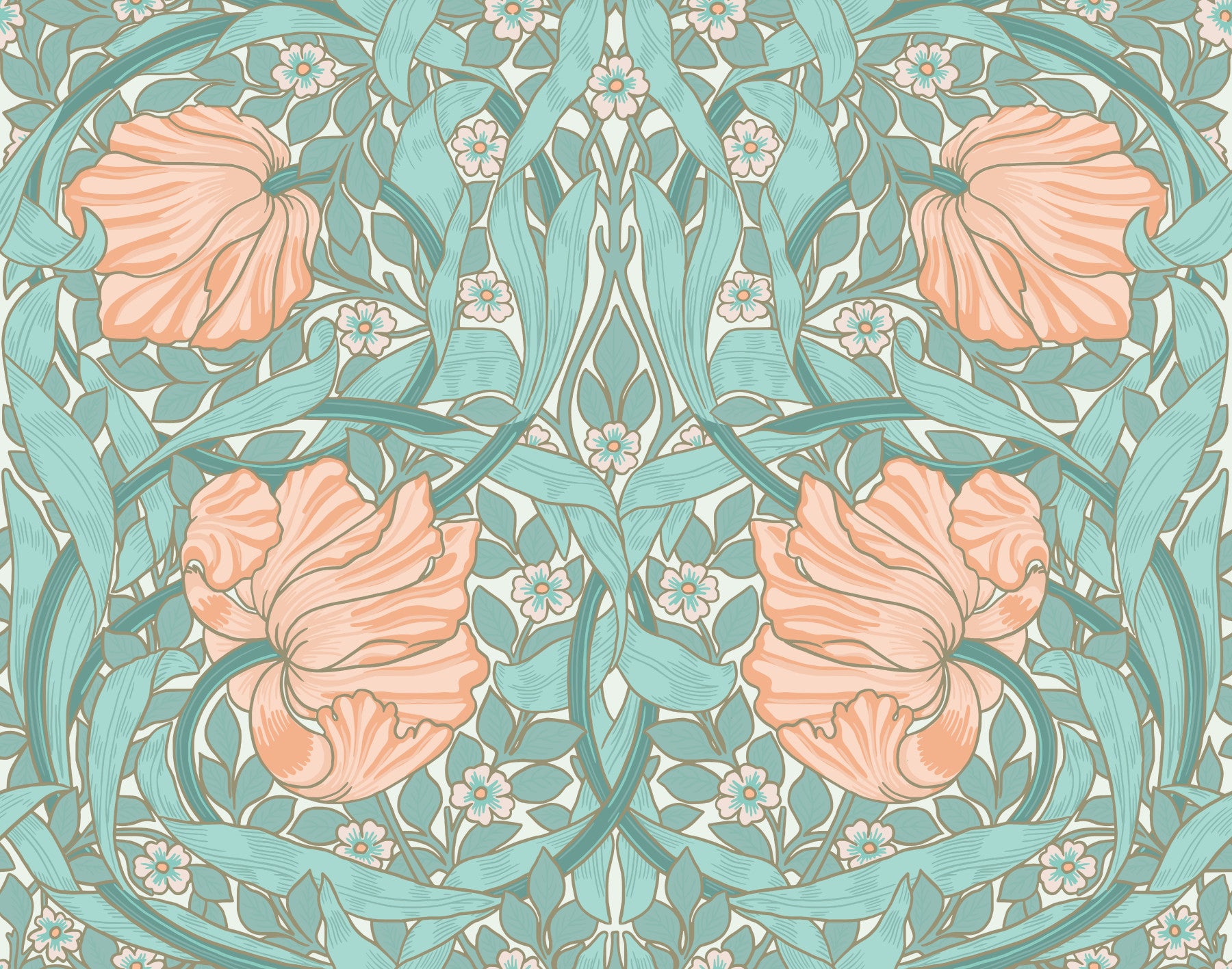 Indulge in the serene beauty of "Pimpernel by William Morris 10." This wallpaper showcases a captivating Art Nouveau design featuring delicate peach-toned blossoms intertwined with flowing, teal-colored leaves. The intricate detailing and symmetrical arrangement create a sense of harmonious elegance, reminiscent of Morris's iconic style. Small, scattered white and pink flowers add a touch of whimsy against the soft background, making it perfect for adding a sophisticated yet calming touch to any space. Experience the timeless allure of classic floral artistry with this refined wallpaper.