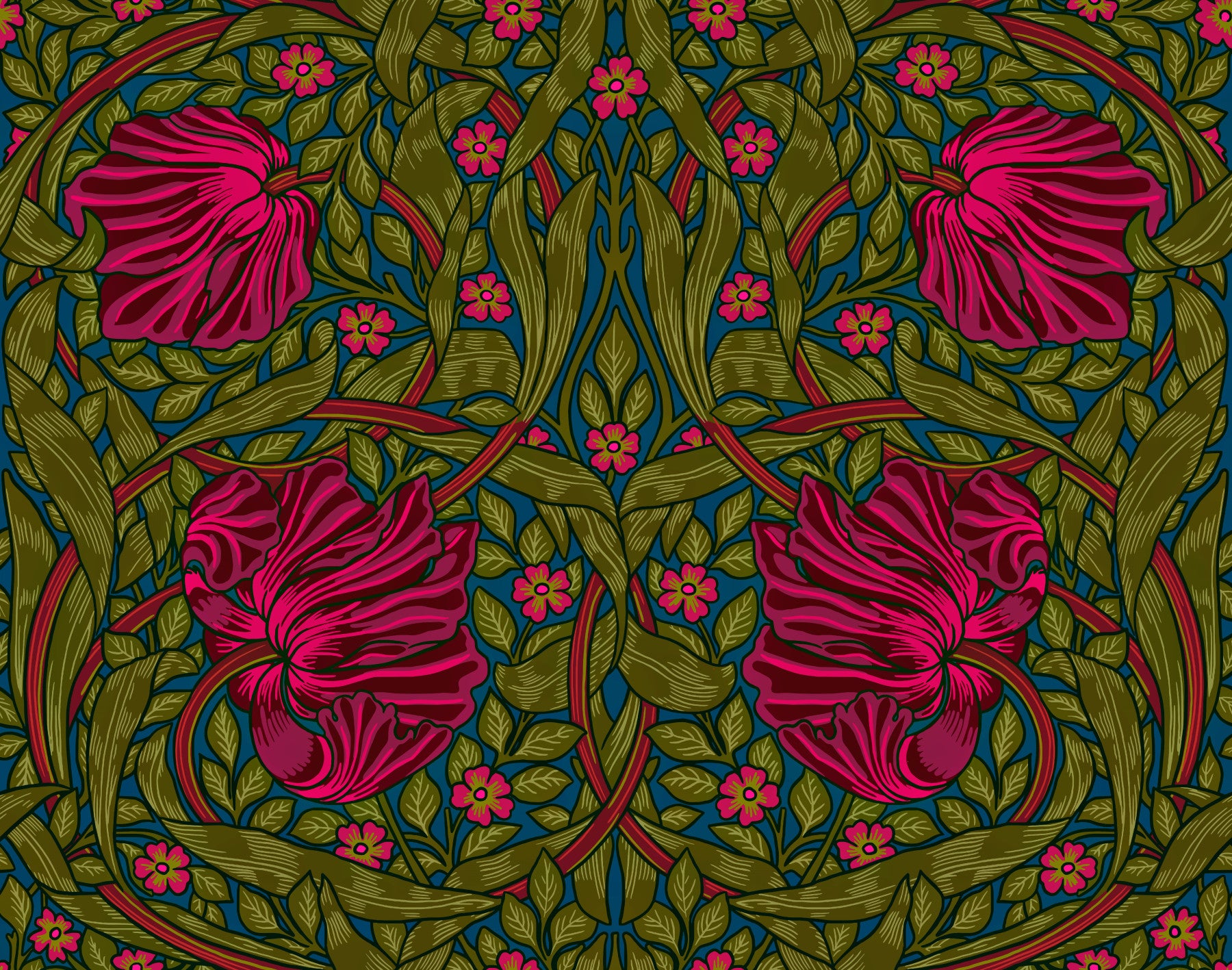 Immerse yourself in the captivating artistry of 'Pimpernel by William Morris 11'. This wallpaper design showcases a mesmerizing tapestry of vibrant crimson pimpernel blossoms, meticulously detailed and rendered in the classic William Morris style. Intricate, swirling stems and lush, olive-green leaves intertwine, creating a dense and richly textured floral pattern against a deep teal backdrop. The design evokes a sense of timeless elegance and refined natural beauty, perfect for adding a touch of vintage charm and sophisticated artistry to any digital space. The bold color palette and intricate detail make this wallpaper a statement piece, bringing a sense of history and artistry into the modern digital age.