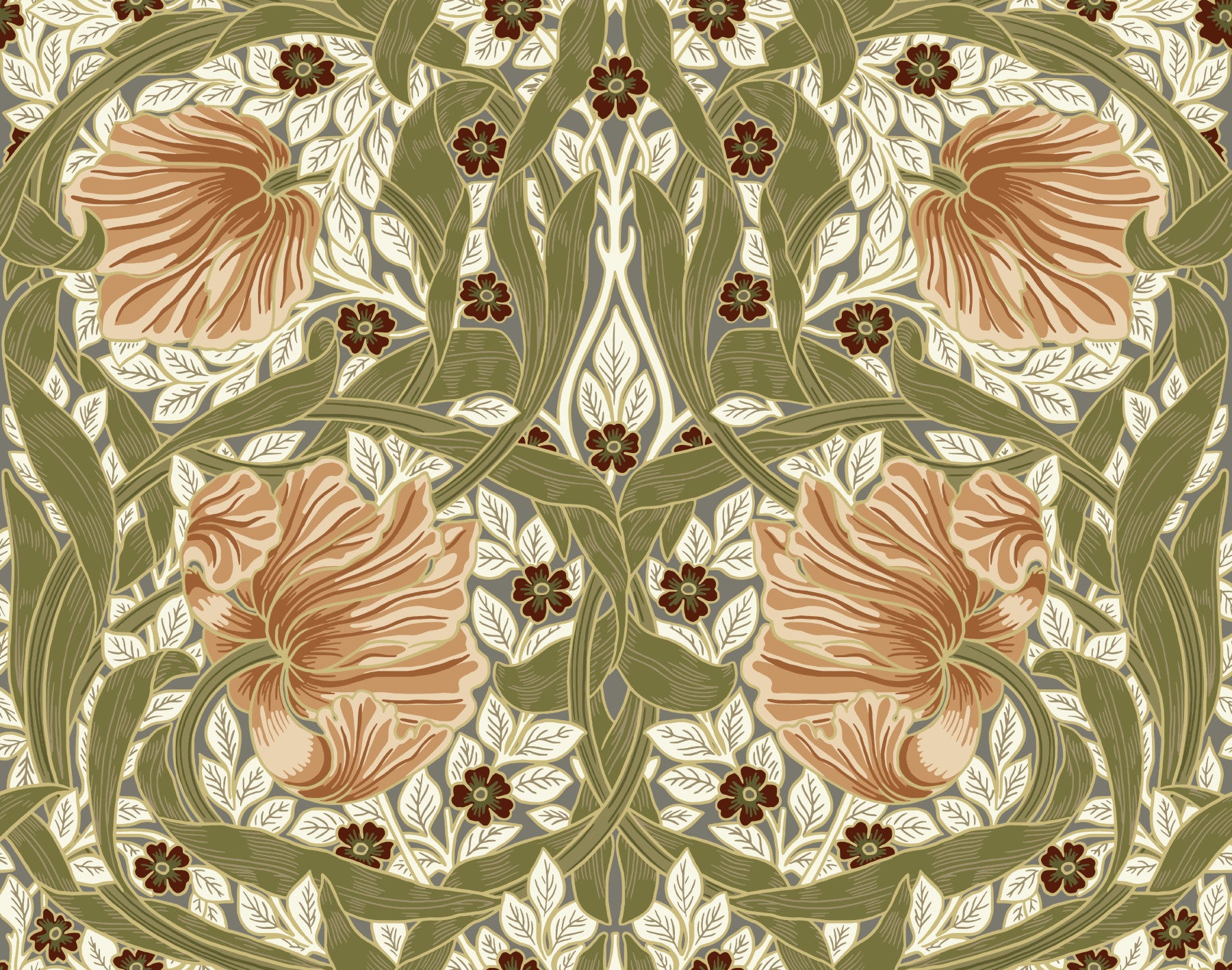 Indulge in the timeless elegance of "Pimpernel by William Morris 7." This wallpaper design showcases a captivating tapestry of stylized tulips in warm, earthy tones, delicately interwoven with flowing leaves and smaller blossoms. The intricate detailing and rich color palette, reminiscent of classic Arts & Crafts movement, create a sophisticated and serene atmosphere. The design's symmetrical composition offers a sense of balance and harmony, making it ideal for creating a refined and peaceful ambiance in any space. Experience the artistry and charm of William Morris reimagined for modern interiors.