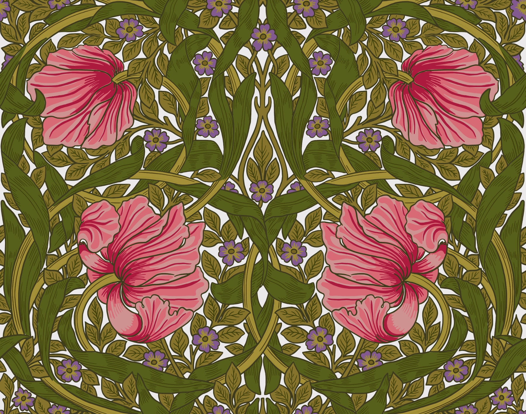 Embrace the elegance of the Arts & Crafts movement with "Pimpernel by William Morris 18." This wallpaper showcases a captivating design featuring richly colored pink pimpernel blossoms intricately interwoven with lush green foliage and delicate purple accents. The detailed, almost woodcut-like style is characteristic of Morris's work, creating a timeless and sophisticated aesthetic. The repeating pattern offers a sense of rhythm and balance, perfect for adding a touch of classic beauty to any room. This wallpaper evokes a sense of calm and natural charm, bringing a piece of history and artistic mastery into your modern space.