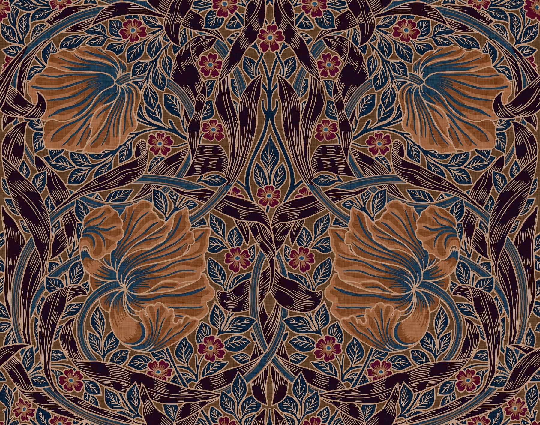 Indulge in the opulent elegance of "Pimpernel by William Morris 3." This wallpaper showcases a captivating tapestry of stylized pimpernel flowers and sinuous leaves, rendered in a rich palette of deep browns, navy blues, and burgundy accents. The intricate details and flowing lines create a mesmerizing Art Nouveau-inspired design, exuding a sense of timeless sophistication and quiet luxury. The textured background adds depth and visual interest, enhancing the overall richness of this visually stunning and distinctly Morris-inspired piece. Perfect for adding a touch of classic beauty to any space.