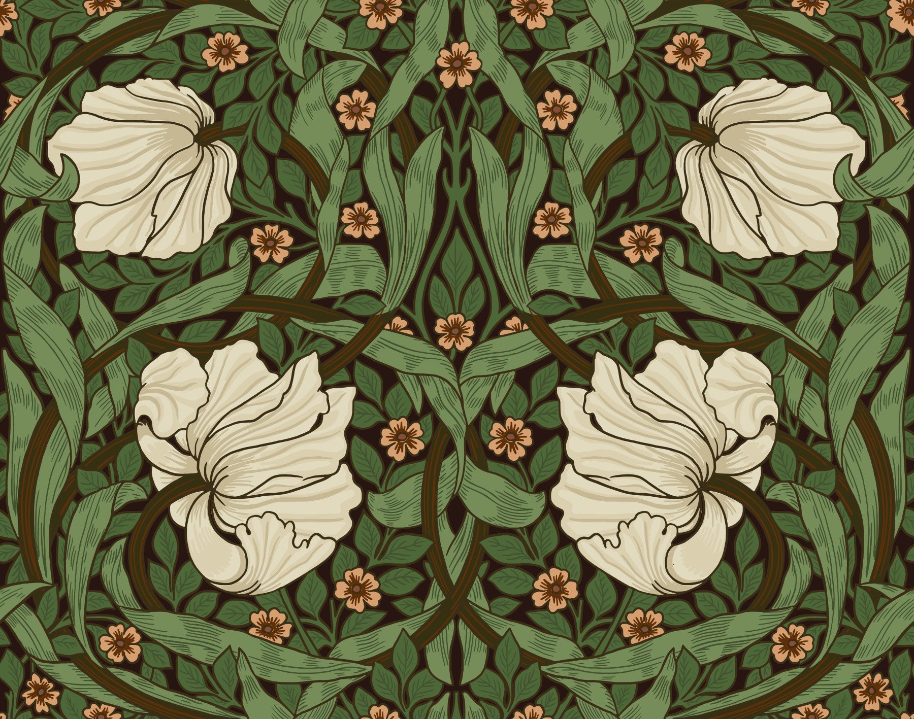 Embrace the timeless elegance of "Pimpernel By William Morris." This stunning wallpaper showcases a rich tapestry of creamy-white stylized flowers, reminiscent of pimpernels, delicately nestled amongst lush, intricately detailed green foliage. The dark, earthy background enhances the floral motifs, creating a sophisticated and serene atmosphere. Inspired by the Arts and Crafts movement, the design features a symmetrical pattern that evokes both natural beauty and artistic precision, making it perfect for adding a touch of classic sophistication to any room. Experience the captivating charm of William Morris's artistic vision brought to life in vibrant detail.